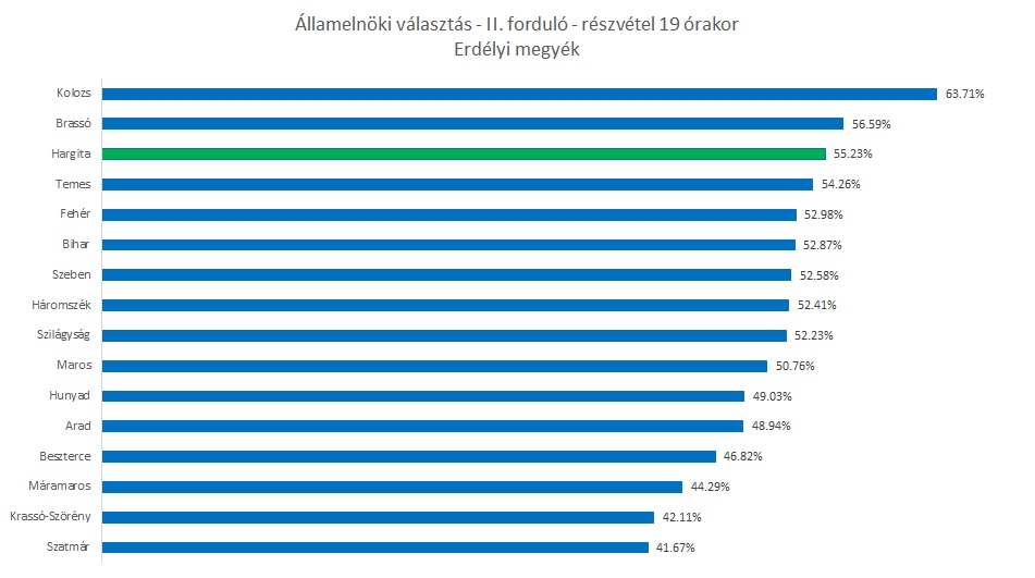 19 óráig az erdélyi megyék közül Kolozs megyében volt a legmagasabb a részvétel, elérve a 63,71%-ot. Ezt követte Brassó megye 56,59%-kal. Hargita megye a harmadik helyen áll 55,23%-os részvétellel, ami továbbra is kiemelkedőnek számít, és messze felülmúlja az országos átlagot.