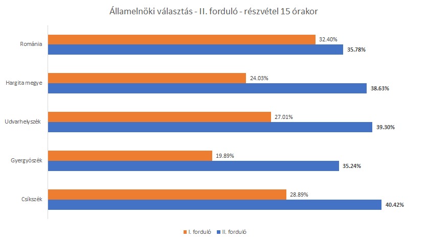 15 órára tovább nőtt a részvételi arány a romániai elnökválasztás második fordulójában: országosan 35,78% szavazott már, szemben az első forduló ugyanezen időpontban mért 32,40%-os értékével. Kiemelkedő a mozgósítás Hargita megyében.