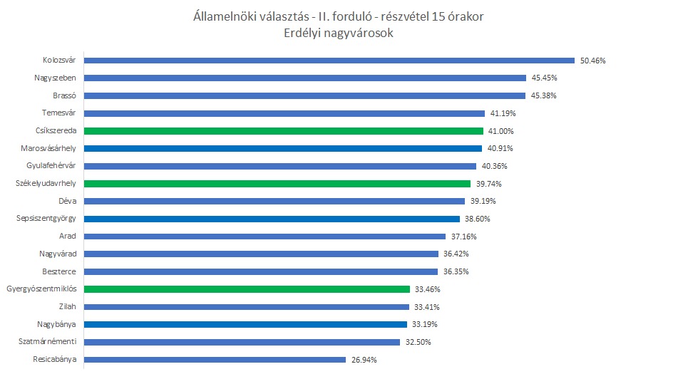 Az erdélyi nagyvárosok közül Kolozsváron volt a legmagasabb a részvételi arány 15 órakor (50,46%), míg Resicabányán a legalacsonyabb (26,94%). A székelyföldi városok (Csíkszereda, Székelyudvarhely, Sepsiszentgyörgy, Gyergyószentmiklós) részvételi aránya az átlag körül alakult, 33 és 41% között. A többi erdélyi nagyvárosban a részvétel 33 és 45% között mozgott.