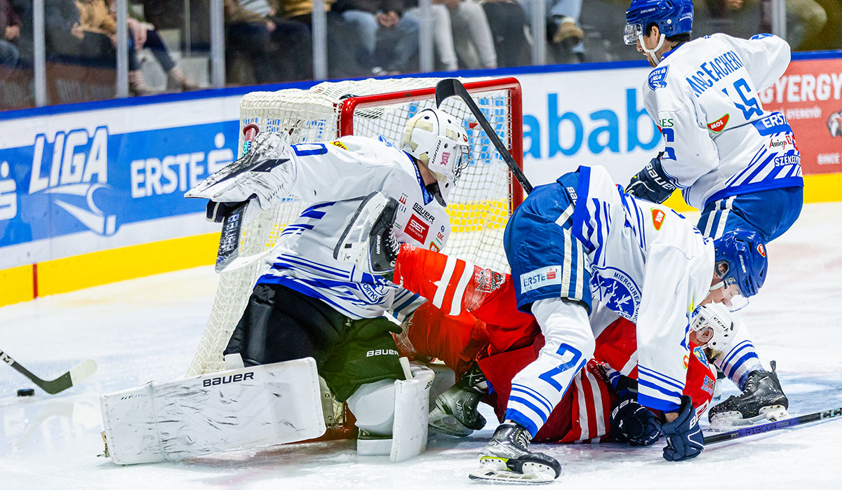 Harc a korongért a csíki kapu előtt a Gyergyói HK – Sportklub mérkőzésen. Egygólos hazai siker Fotó: ersteligapress