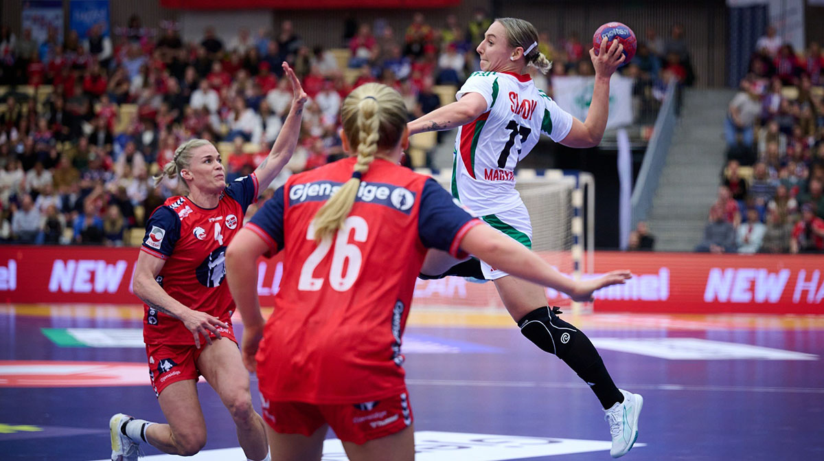 Simon Petra lő kapura a norvégok elleni felkészülési mérkőzésen. A 21 éves irányító nyerőember lehet a vb-n Fotó: Kenneth McDowell/MKSZ