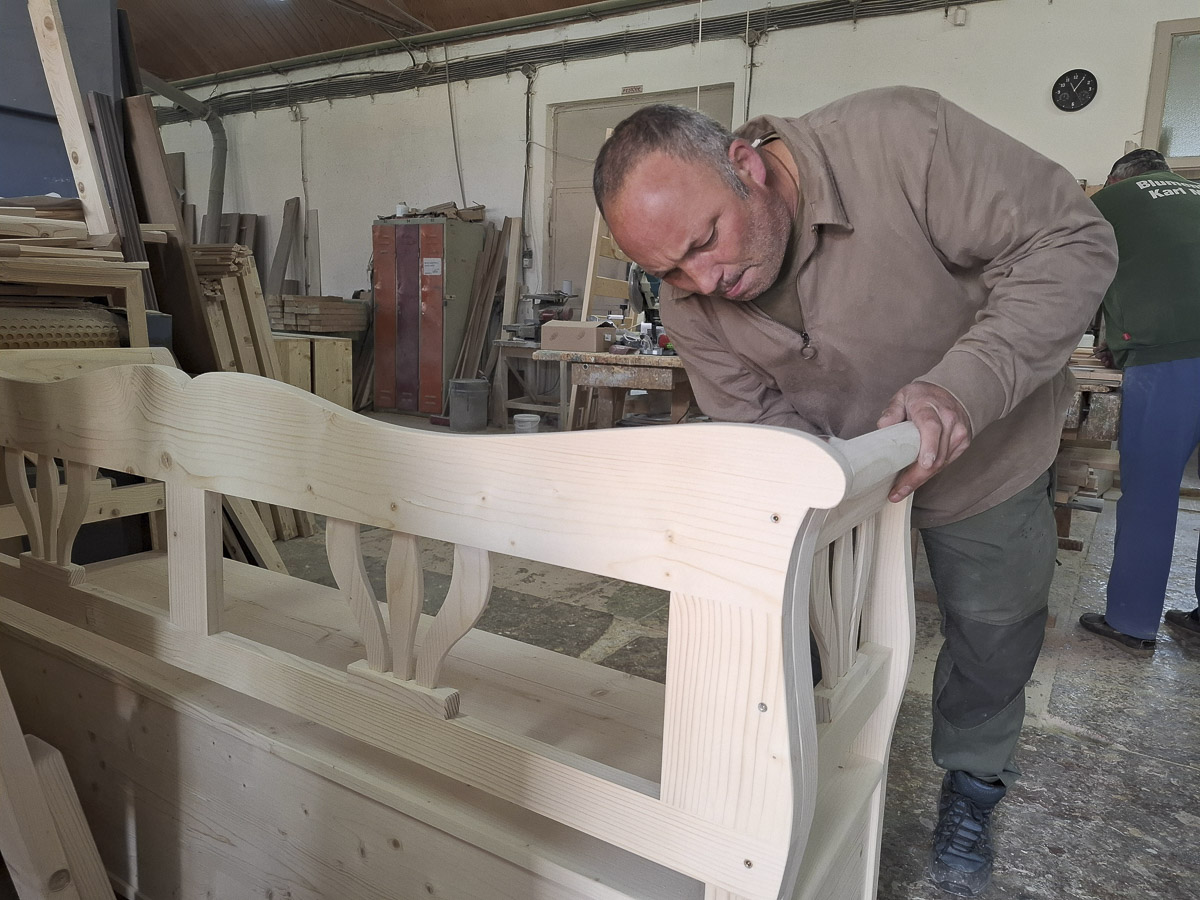 – Kihívás volt ezt a padot elkészíteni. Régen a falusi bácsi otthon, a műhelyében megcsinálta, volt ideje is, türelme is. A karfa íve megfogott, nem volt olyan marófej hozzá, de megoldottuk.