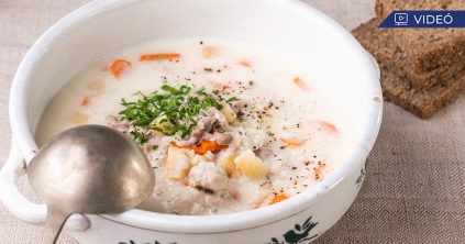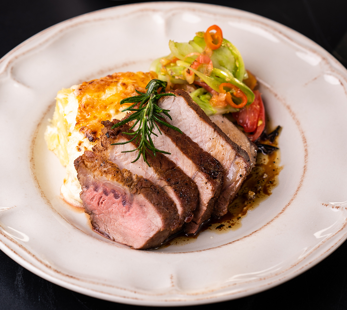 Póréhagymás rakott krumpli sertésbélszínnel, zöldparadicsom-salátával