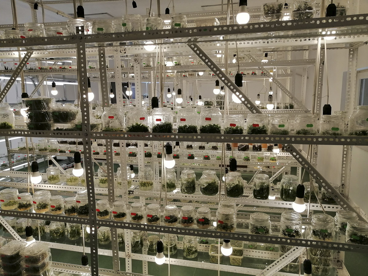 A laboratóriumban világos, tágas térben, többszintes állványzat polcain számtalan tégelyben apró növénykék zöldellnek. János Erika magyarázza: a mikroszaporító labor lényege, hogy vírusmentes növényi anyagból, ellenőrzött körülmények között szaporítanak fel különféle növényeket. A folyamat alapja a táptalajkészítés: minden növénynek saját receptje van, amely tartalmazza a szükséges ásványi anyagokat, vitaminokat és mikroelemeket. A laborban a növények fejlődését úgy irányítják, hogy az adott igényeknek megfelelően vagy a gyökeresedést, vagy a sokszorosítást helyezik előtérbe.