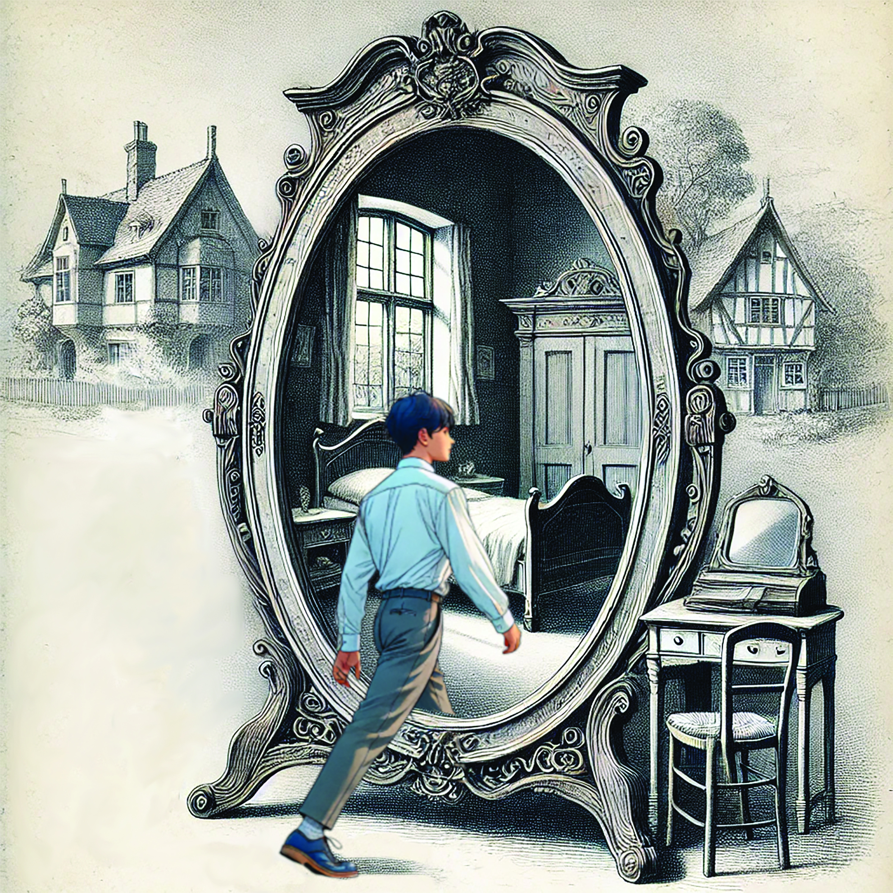Tóth László írásának főhőse Pityu, aki az új lakásukban, egy sokat megélt régi házban szembetalálja magát a rejtélyes tükörrel. Ifjú titánunk túl közel kerül a bútorhoz, átlép rajta, s ez a mozdulat kalandok sorozatát indítja el. Kapcsolatba lép a manókkal, s egyből egy karitatív feladat is vár rá, a beteg manókislány eljuttatása a gyógyító tengerhez. Természetesen ez nem megy könnyen, megpróbáltatás megpróbáltatást követ, hogy mi is lesz a vége, ezt nem árulhatom el a naiv Olvasónak. Hősünk nem bíz semmit a véletlenre, alternatív tudományos ismereteit Párizsban gyarapítja, s végül a bimbózó szerelem is élete részévé válik.