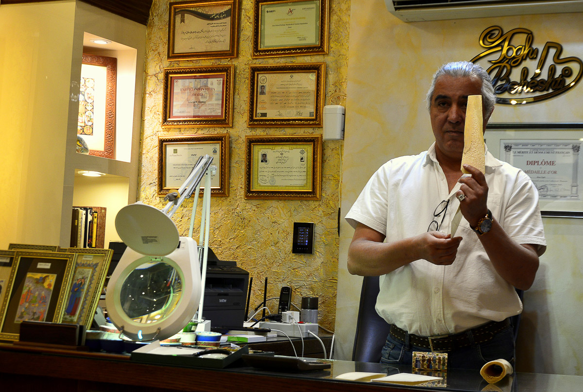 Ugyanitt jutottunk el egy miniatúrákat készítő művészhez is. A miniatúra a középkorban keletkezett mint szöveget díszítő kis kép, színes kompozíció, azaz eredetileg könyveket illusztrált, ám mostanra készítésük önálló művészeti ággá vált. A perzsa miniatúra eredetileg kínai, mezopotámiai és szíriai hatásokat ötvözött, de a 15–16. századra kialakult a saját stílusa. Mivel nincs vallásos jellege, ezért iszlám területen is leginkább alakokat ábrázol. Csontlapokra festik rendkívül vékony ecsettel, amely esetleg csak egy szőrszálból áll. Mivel már itthonról vágytam egy ilyen nagyon finoman kidolgozott miniatúrára, a híres mester műveiből válogattam egy gyönyörű, virágokkal díszített tündérrajzot. A kép kerete fa, középen intarziadíszítéssel, ami önmagában is lenyűgöző kézműves alkotás.