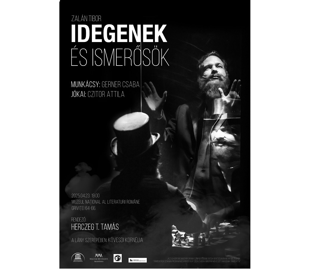 A Jókai 200 emlékév alkalmából a békéscsabai Jókai Színház Zalán Tibor Idegenek és ismerősök című előadásával vendégszerepel Bukarestben – közölte lapunkkal a Liszt Intézet. Az előadást április 23-án, szerdán 19 órától a Román Nemzeti Irodalmi Múzeum színháztermében (Calea Griviței 64–66.) mutatják be, a szerző jelenlétében. A közlemény szerint a darab két 19. századi személyiség, Munkácsy és Jókai fiktív diskurzusán keresztül a 21. század dilemmáit járja körül, középpontba állítva a művész nemzethez való viszonyát és szerepvállalását. A színdarab hossza 80 perc, és román felirattal lesz látható. Az előadás után pódiumbeszélgetést tartanak a szerzővel, Zalán Tiborral, valamint a szereplőkkel. A közönség kérdezhet, véleményt mondhat, bepillantást nyerhet a darab hátterébe – írták.