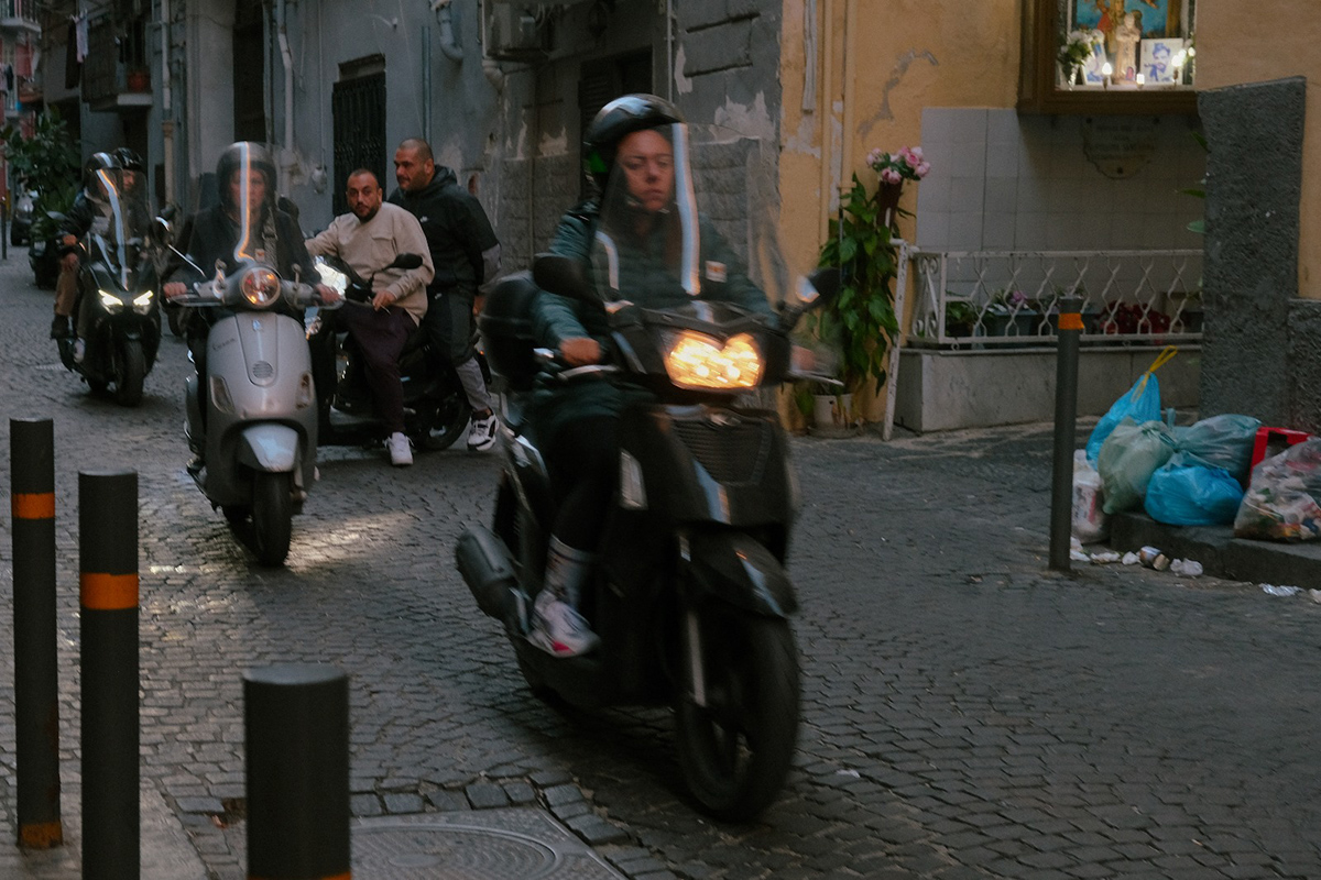 Aznap már nem megyünk az óvárosba, csak a környéket fedezzük fel. Nápoly a keskeny utak, a krumpliorrú kisautók és főleg a hangosan burrogó robogók városa. Mindenki motorozik. Gyermekarcú kamaszok, magassarkús, kiskosztümös hivatalnokok, görbe öregemberek rázkódnak ócska járgányokon.