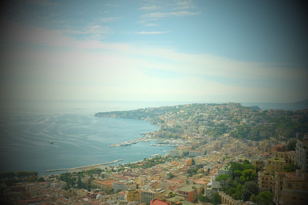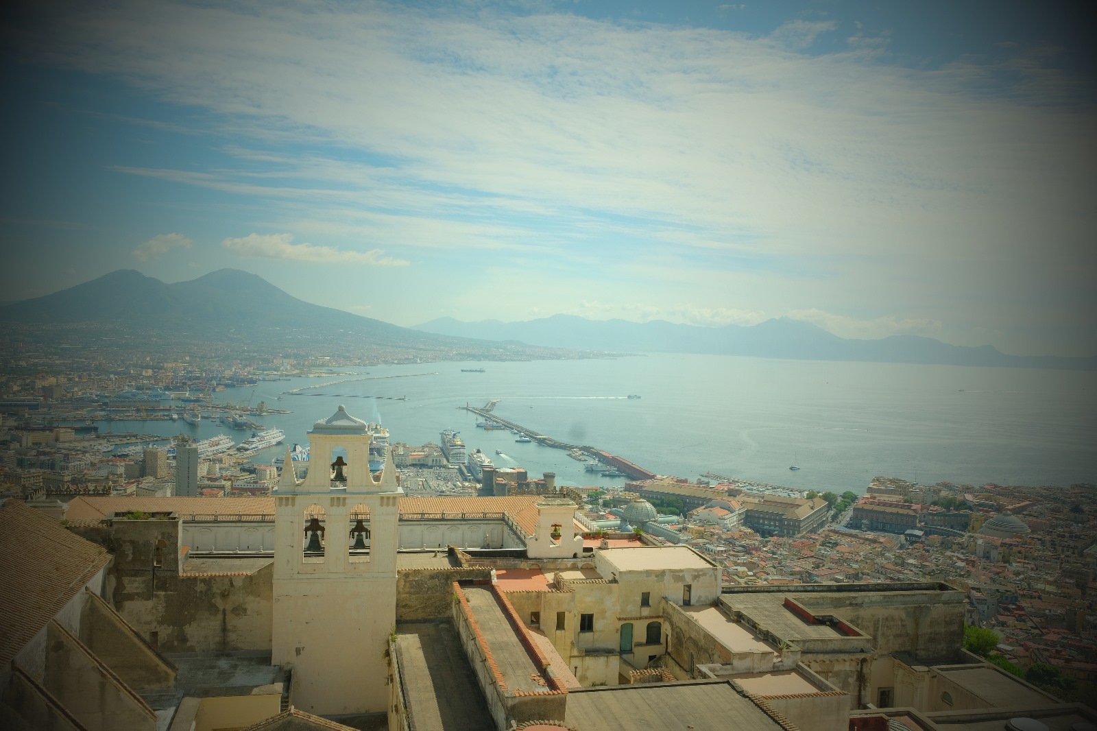 A bástyákról letekintve belátni egész Nápolyt: fehér és sárga háztetők, tarka teraszok, ragyogó, szinte világító tenger. A távolban kék hegyorom, úgy őrködik a város felett a Vezúv, mint öreg, szigorú istenség.