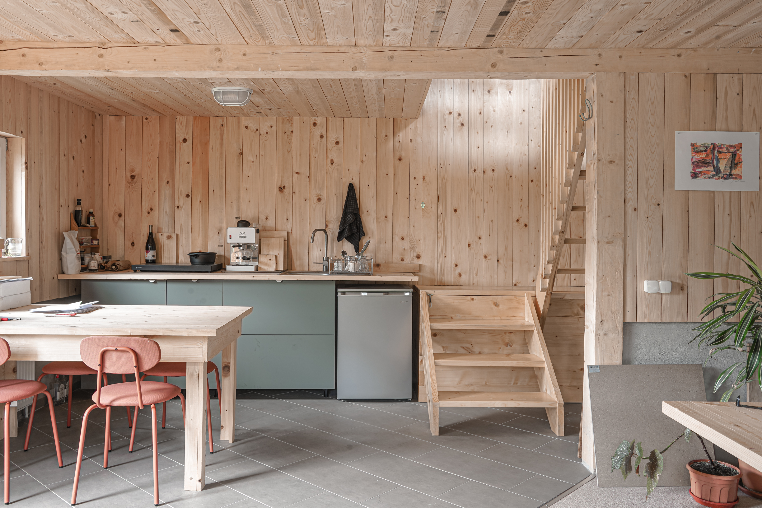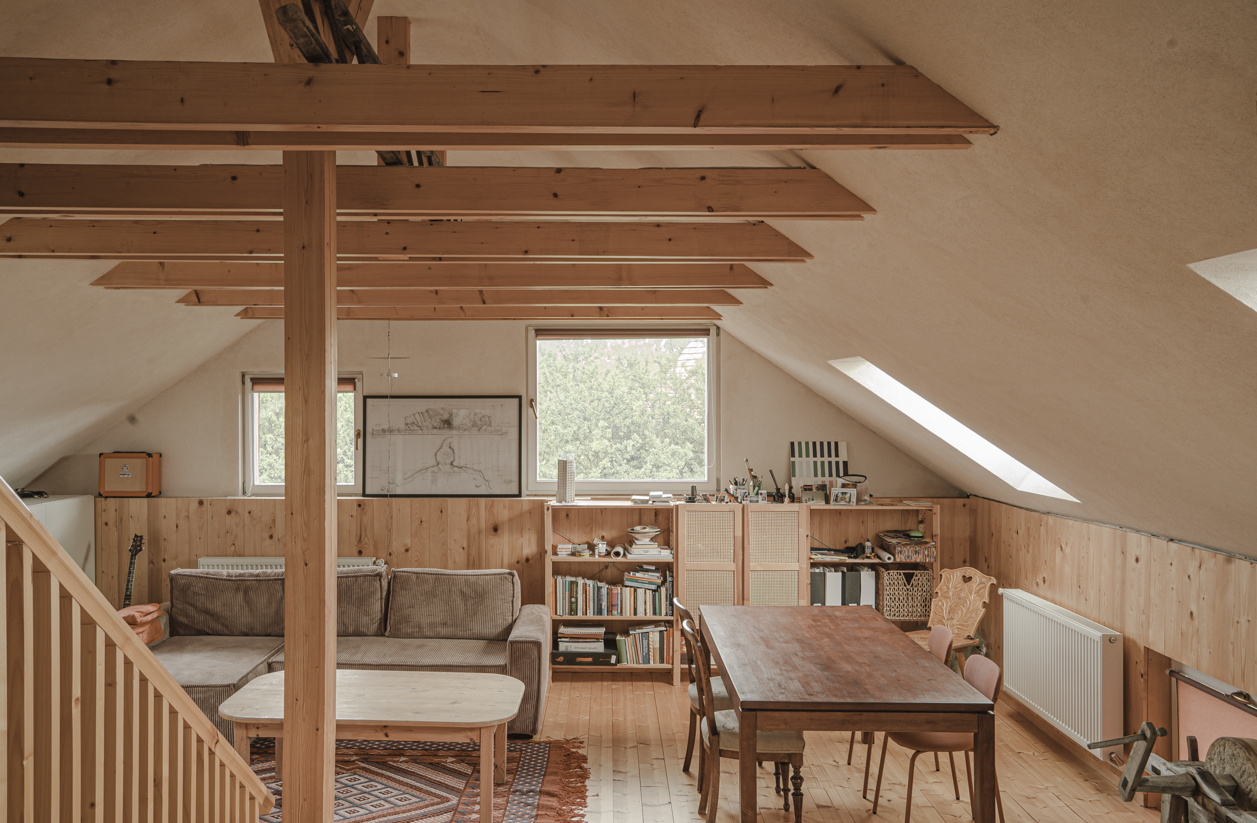– Mint minden háznál, minden portán, itt is volt egy csűr a ház mögött. Általában mi van a csűrben? Legjobb esetben állatok, ha meg nem, akkor kacat. Ebben is kacatot tároltunk. Testvéremet az egyetemi évei alatt is foglalkoztatta a gondolat, hogy miként lehetne a csűrt lakássá vagy műhellyé alakítani, amire több variáns is született. Bennem először akkor született meg annak gondolata, hogy a csűrt hasznosítsuk valamilyen formában, amikor hét évvel ezelőtt első lányunk keresztelőjére kerestünk egy jó helyszínt. Nem volt a legjobb állapotban, de kitakarítottuk, lepucoltuk a falakat gőzborotvával, csak a szerkezet maradt, kidíszítettük, és itt tartottuk meg a keresztelőt – ecseteli az ifjú építész.