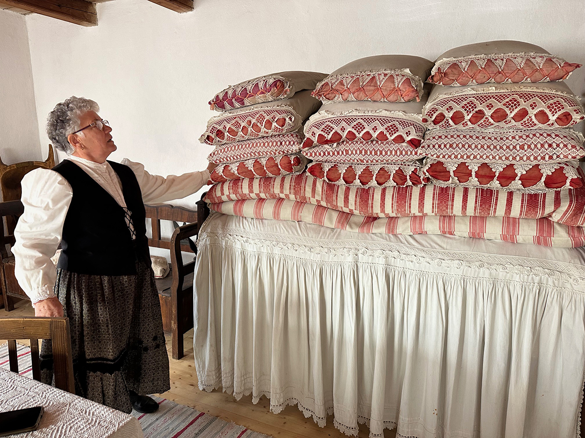 – Édesanyámtól maradt a vetett ágy, amelyen tizenkét párna van… Az ágyterítők, abroszok, falvédők, ágyneműk mind ki voltak varrva, csipkével beszegve. Ezek egy részét ma is őrizzük.