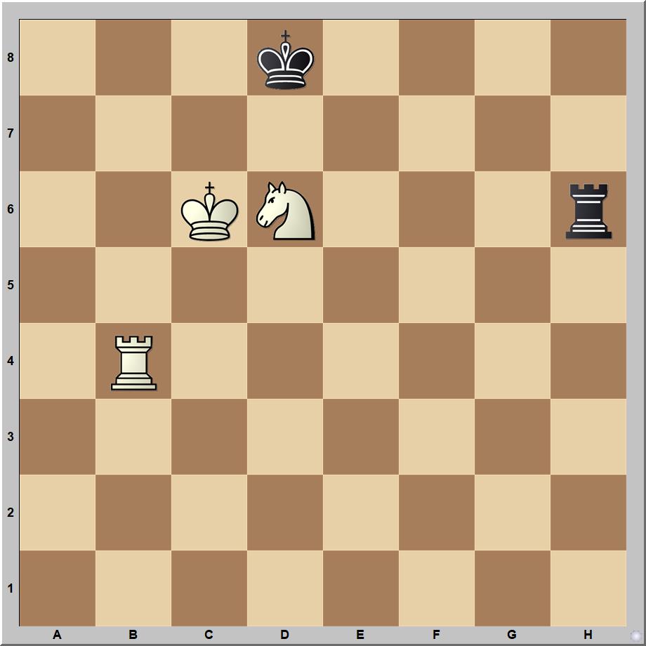 A bástya és huszár ritkán nyer a bástya ellen. Henri Rinck francia szerző 1952-ben alkotott miniatűr tanulmányában viszont minden adott a teljes pont begyűjtéséhez: a sötét király le van szorítva, bástyája pedig nincs az első soron. A megoldás: 1.Be4! Be6! (1...Bh8 után 2.Hf7+ Kc8 3.Hh8 Kb8 4.Ba4! Kc8 5.Ba8 matt) 2.Bf4!! (2.Be6? patthoz vezet) Bh6 (2...Ke7 3.Bf7+ Kd8 4.Bd7 matt vagy 2...Be1 3.Bf8+ Ke7 4.Be8+ lenyeri a bástyát) 3.Bf7! Bh7! 4.Hb7+!! feloldja a pattot, majd 4...Ke8 (4...Kc8 5.Bf8 matt) 5.Bh7 Kf8 6.Kd6 Kg8 7.Bd7 Kf8 8.Ke6 Kg8 9.Kf6 Kh8 10.Kg6 Kg8 11.Bd8 matt következik.