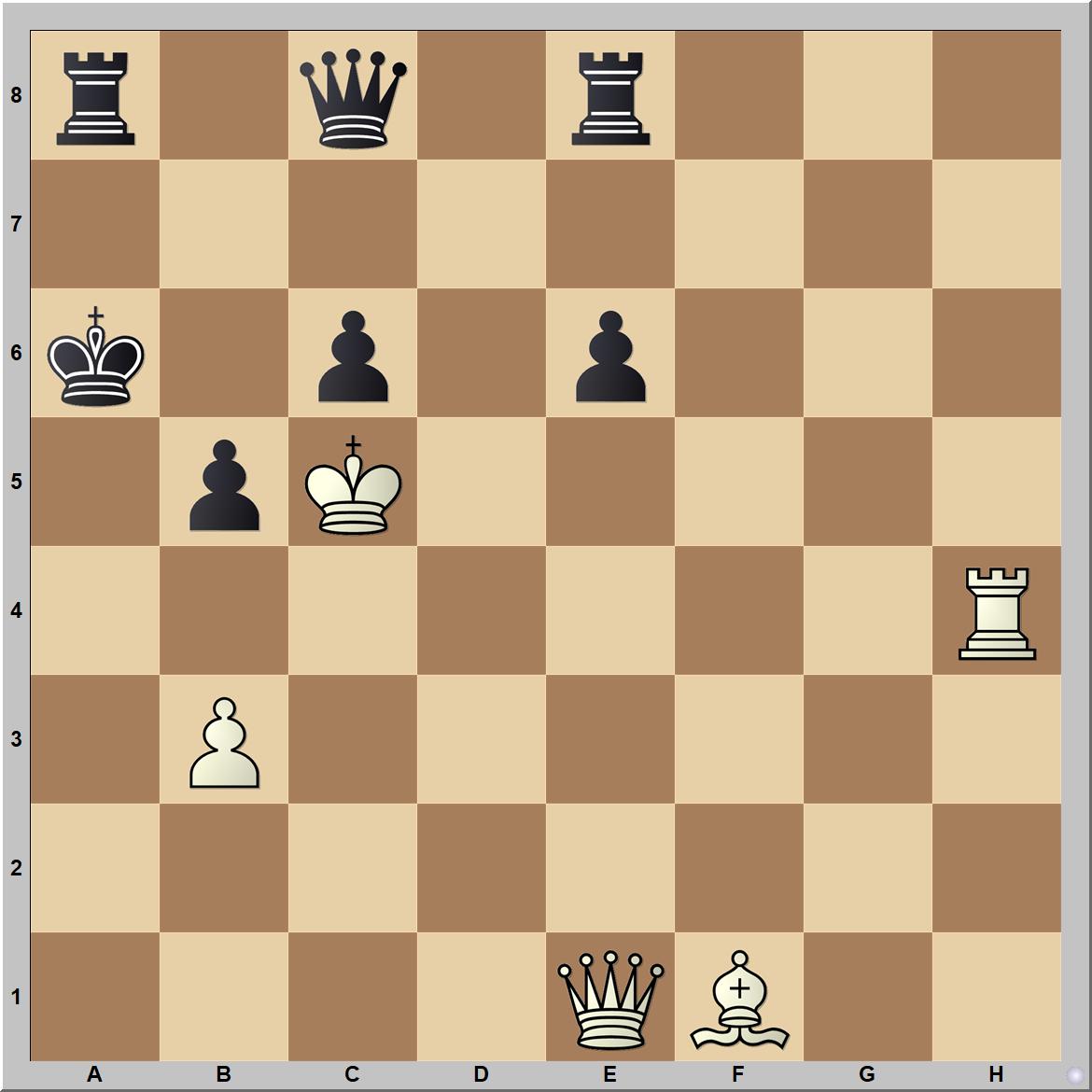 Világos két nehéztisztét feláldozva gyalogjával ad mattot három lépésben: 1.Va5+!! Ka5 (1…Kb7 2.Vb6 matt) 2.Ba4+!! ba4 3.b4 „paraszt-matt” (1-0).