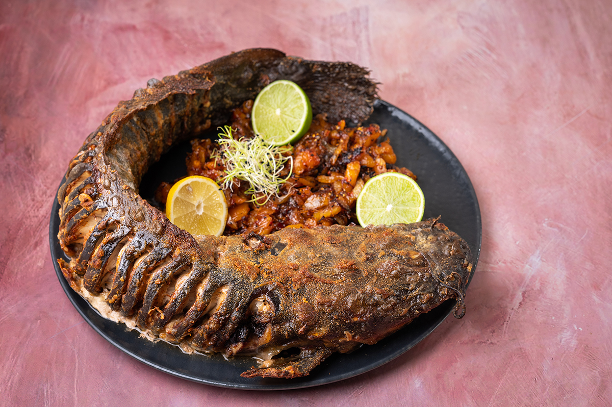 Egészben sült harcsa aszalt barackos hagymával