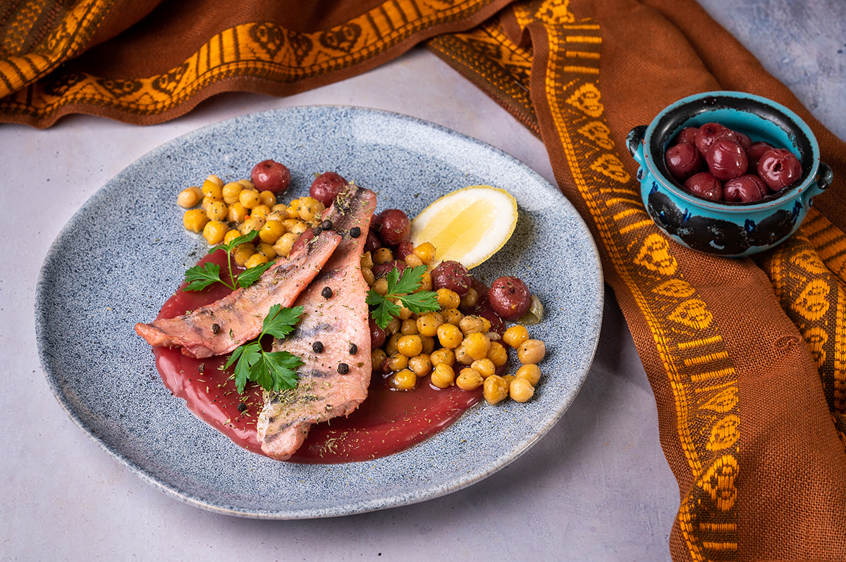 Meggylében párolt fogasfilé, pirított csicseriborsóval és citromos meggyszósszal
