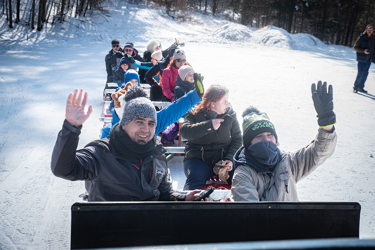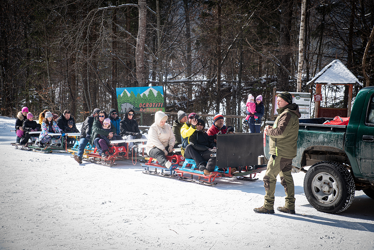 Miközben erről beszélgettünk, Gombi sóvárgó szemekkel figyelt minket. Bizonyára megkívánta a kürtőskalácsot. Gazdája egy feltétellel, de megengedte, hogy megkínáljam. Nem szabadott adni addig a kalácsból, míg nem mondtam: tessék! Ügyes kutya – állapítottam meg, hiszen tényleg csak a „biztatás” után fogadta el a falatot. No, de nem ettől számít ő hegyi asszisztensnek, hanem inkább attól, hogy hamar jelzi, ha éppen vad jár, és ahogy a gazdája mondta: „hívó szóra, medve nélkül érkezik vissza”. Habár – mint megtudtuk – a télen mindössze egy alkalommal tette tiszteletét a medve, akkor is este. A turisták azonban ennél jóval sűrűbben – hétvégi napokon akár több százan is – látogattak a krátertóhoz. Különösen zsúfoltság volt a szilveszter előtti napokon, illetve az új év első hetén. Még a kora tavaszi napokon is, hó függvényében, lehet szánkót bérelni másfél órás ciklusokra. A tó partjáról terepjáróval, speciális vontatóval történik a szánkók felvonása. A szánkózási lehetőségekről, aktuális információkról mindenképp érdemes előre tájékozódni a Pro Szent Anna Egyesület Facebook-oldalán.