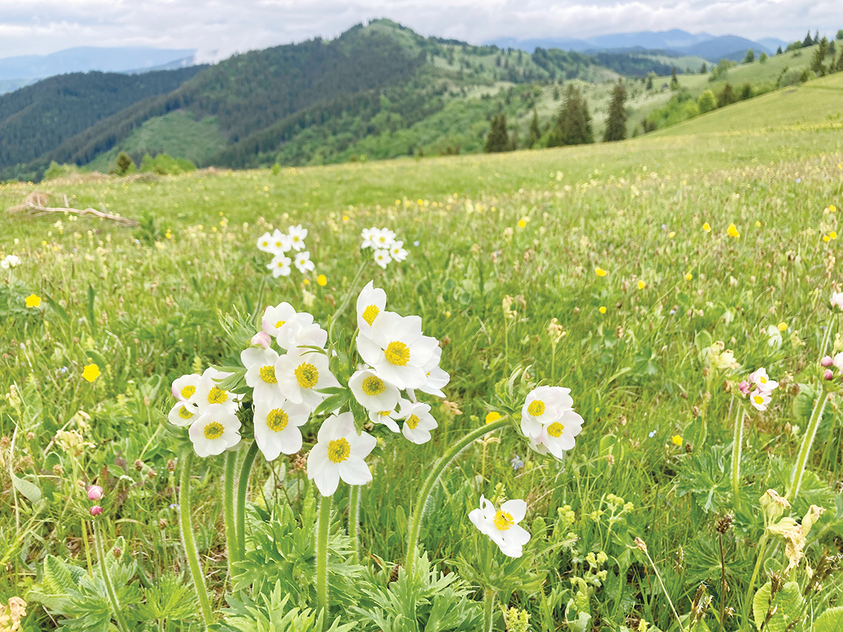 Zöld legelők, fenyők és kevés lombhullató, igazi havasi táj vesz körbe, miközben rálátunk a mély völgyekre és azokra a jellegzetes gyimesi hegyoldalakra, ahol – mint egyszer egy kedves barátom megjegyezte – a tehenek is mintha térdelve legelnének. Ez a hely egy ingyenes botanikus kert, egy helyen ennyi növényritkasággal, gyönyörű virággal ritkán lehet találkozni. A tavasz felülmúlhatatlan ebből a szempontból, nyárban valóságos csodakert, és megvan a varázsa annak is, amikor már deres a táj, de az elszáradó fűből még kivillan az őszi tárnics intenzív kékje.