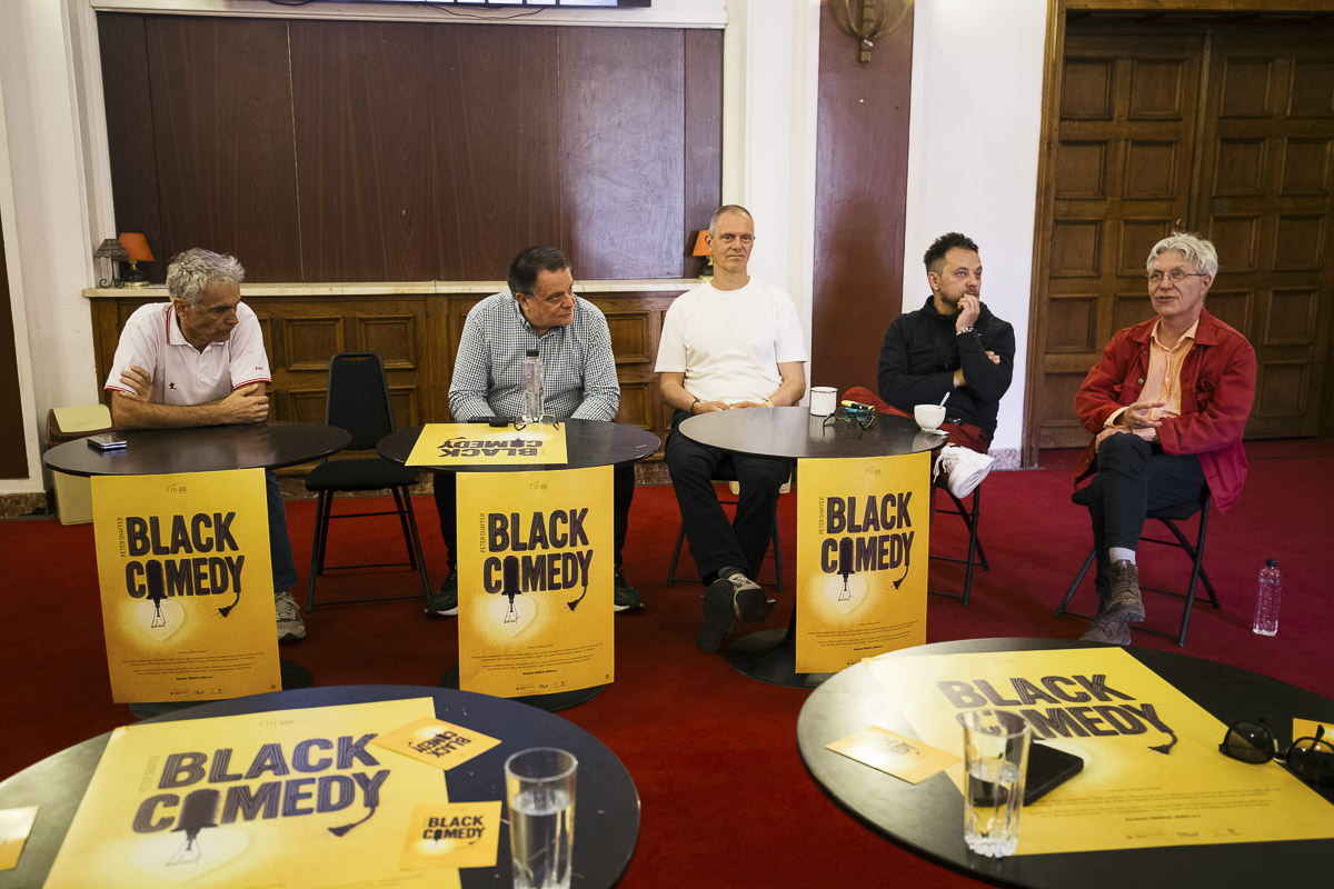 A csütörtöki premier előtt ma 19 órára nyilvános főpróbát hirdettek, az első ötven jelentkező vehet részt az eseményen. A bemutató után ebben a hónapban még hat alkalommal játsszák a Black Comedyt, és júniusban is lesz még néhány előadás – tudtuk meg a színház előterében tartott sajtótájékoztatón.