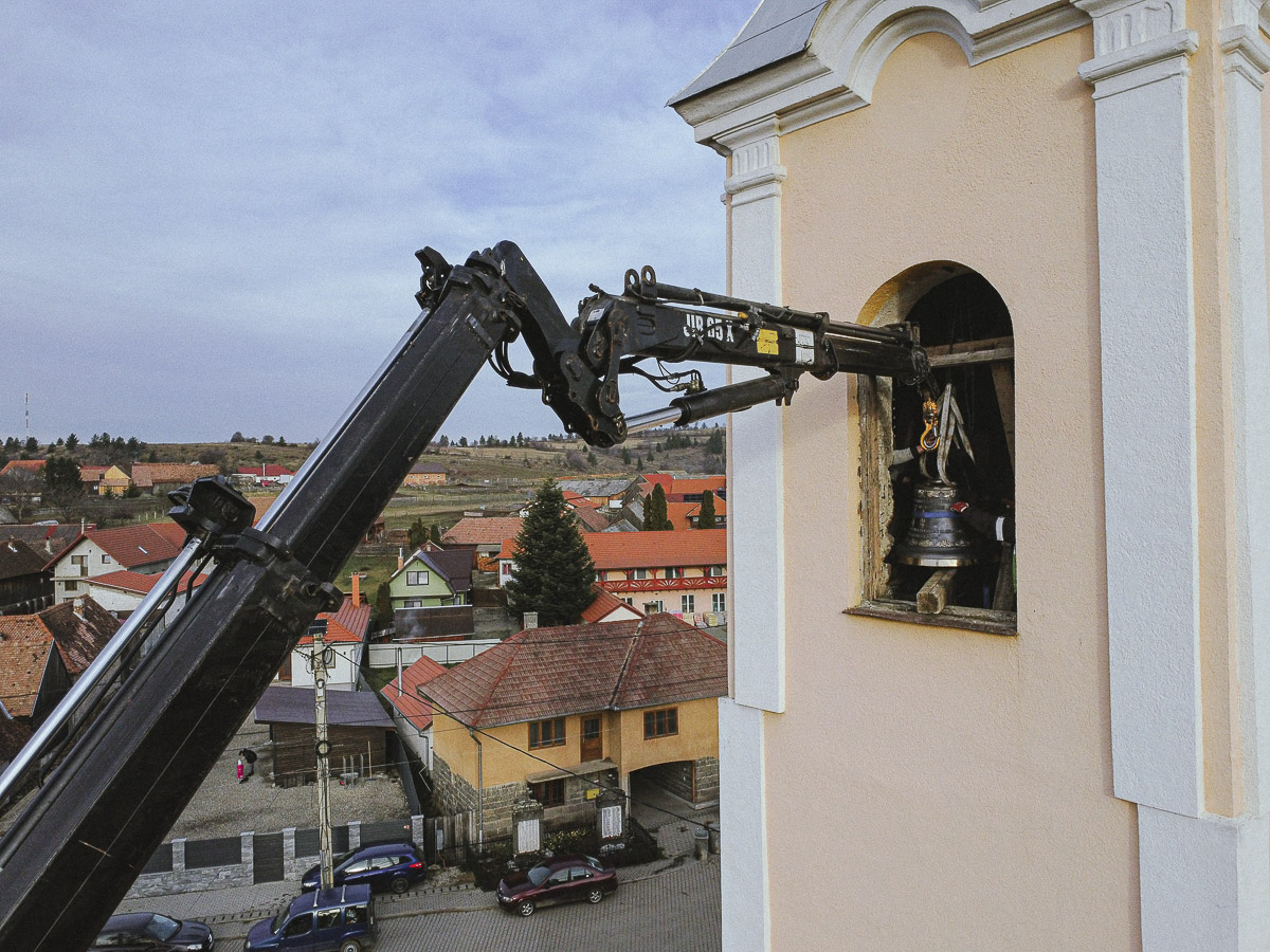 Látványos munkálatokkal szerdán kicserélték a kápolnásfalusi római katolikus templom tornyában a régi harangokat az újakkal.