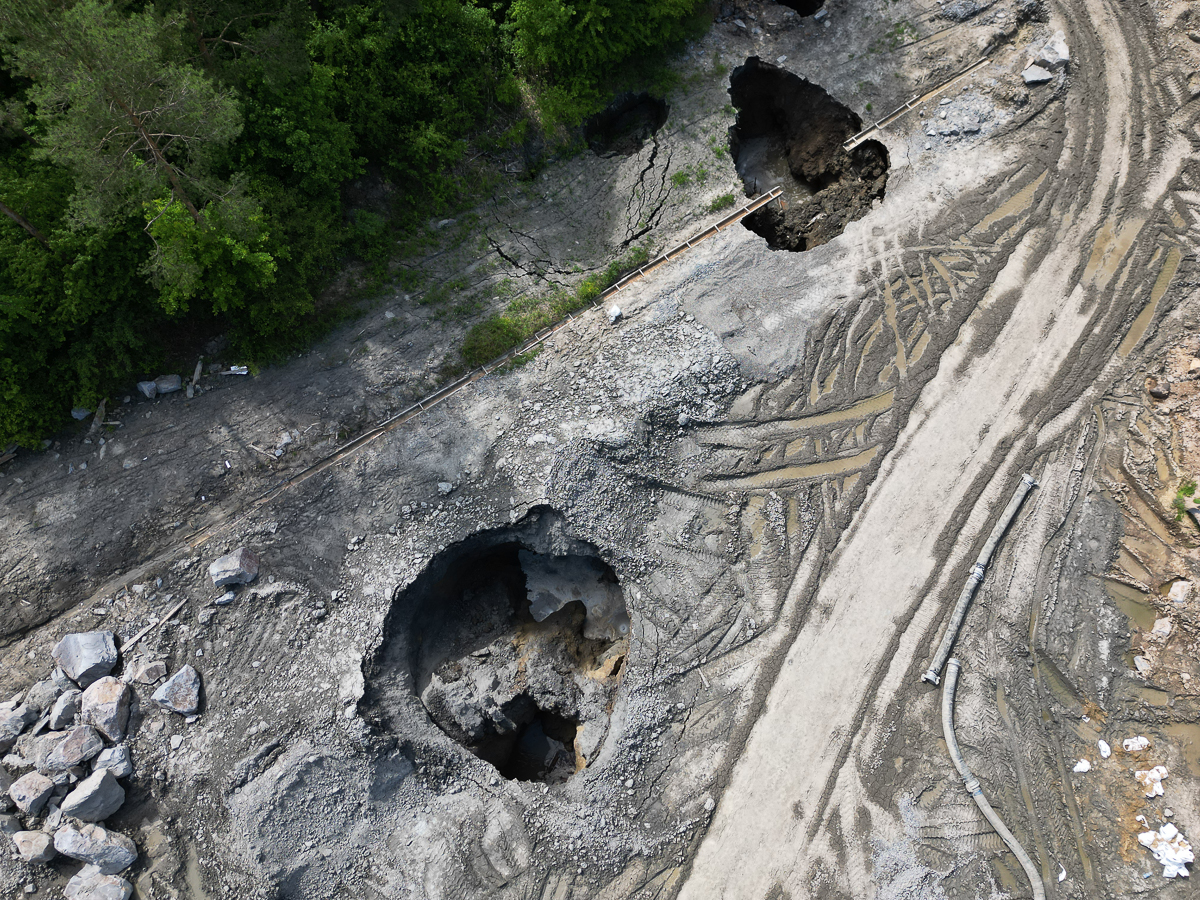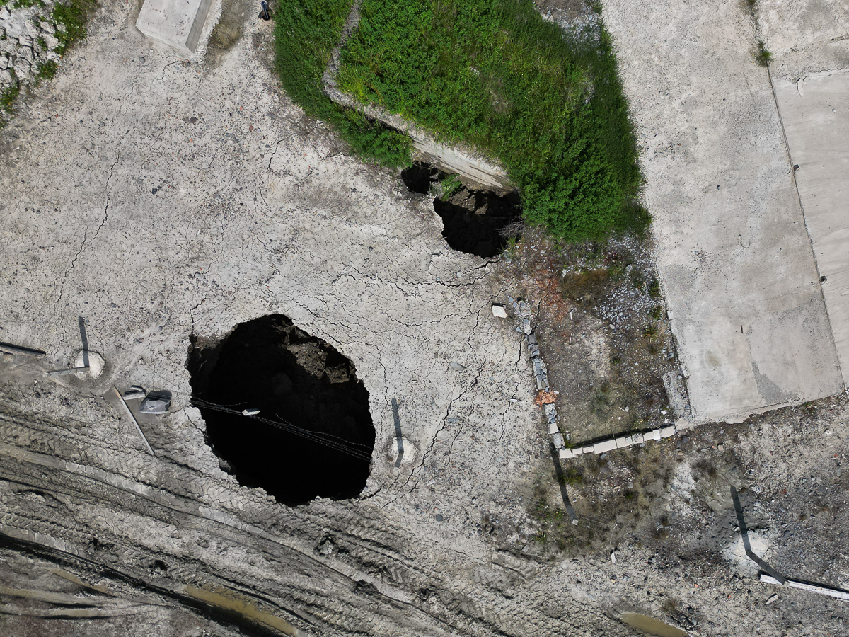 A bányatárnák felett folyamatosan omlanak be újabb talajdarabok. Helyenként látni, ahogy a töltés és a sóréteg megszakadozott, csak idő kérdése, mikor roskadnak azok is a vízbe.