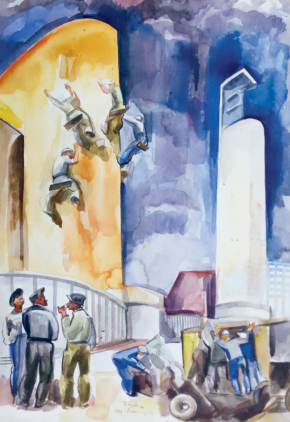 Csíki Székely Múzeum, Csíkszereda, ltsz.: 1188[/caption] Nagy Imre képi jegyzetein legalább annyira fontos a munkások karakterének, mozgásának megjelenítése, mint az épületek részletei, s valószínűleg inkább határidők feszessége okozhatta az ellenérzést a gondtalanul festegető idegen iránt. Az európai pavilonok többségét az akkori sztárépítészek – az olaszt Marcello Piacentini, a németet Albert Speer – tervezték a vasbeton moder- nizmus jegyében, természetesen különféle nemzeti jelvényekkel és jelképekkel felékesítve. Nagy Imre akvarelljein az Eiffel-torony árnyékában előtűnik a német és a szovjet pavilon (Borisz Iofan) Vera Muhina Munkás és kolhozparasztnő lendületes párosával, a román épület íves-oszlopos bejárata (Duiliu Marcu) és a Pont d’Iena egyik lovasa mögött Nagy-Britannia pavilonja (Oliver Hill). Csak egy képen ismerünk rá a Muhina-szobor háttérében a magyar épület jelképes templomtornyára (Györgyi Dénes). Szücs György