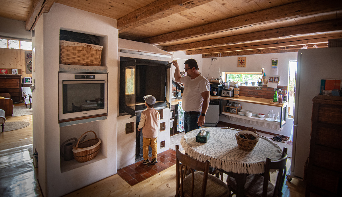 Zoltán mosolyogva mondja, napközben a nappali a kedvenc tartózkodási helye, este pedig a galéria, ahonnan a kilátás pazar, az esti fények pedig varázslatosak. Réka büszkén mutatja a konyha, de mondhatni, a ház egyik meghatározó ékét, a kályhát. Különleges egyedi darab, Zoltán ötletei, tervei szerint készült, egyszerre látja el a kandalló és sütő szerepét is. Tulajdonképpen a két különálló térből álló kályha felső része családi összejövetelek során barbecue-kályhaként funkcionál. Az alsó részben gyújtják meg a tüzet, melynek füstjét át tudják vezetni a felső részbe, ide helyezik be a konyhában a húsokat, s ha azok elkészültek, a kályha nappali felőli nyitható ajtaján tálalják is. De nemcsak barbecue készítésére alkalmas a felső különálló tér, nagyon hideg téli estéken ide is be lehet gyújtani. A hőleadás dupla kémény segítségével történik, azaz a kémény belső terében egy kerámiacső van elhelyezve, a téglafalnak pedig kitűnő a hőleadó képessége, a kimondottan erre a célra kialakított nyílásokon áramlik a meleg a lakásba, kifűtve annak mind a 180 négyzetméterét, a konyhától a hálóig.