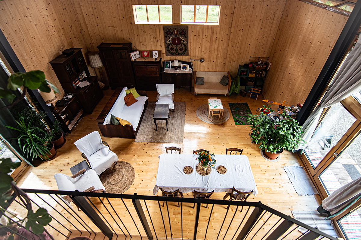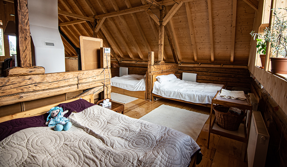 Bár van, aki furcsállja, számukra korántsem zavaró, hogy a család tulajdonképpen egy légtérben éli mindennapjait, nincsenek elkülönített kis terek, szobák, ezáltal is megőrizték a csűr eredeti nyitottságát. A galériában tágas, háromágyas hálórész van kialakítva, ez azért is jó megoldás számukra, mert kicsi gyermekeik nagyban igénylik még a szülők közelségét.