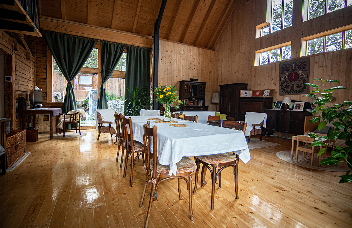 A néhány évvel ezelőtt még omladozófélben lévő egykori háromterű csűr mára már tágas otthon, amelyet idén márciusban vett birtokba a család. Átmeneti megoldás ez – mondják, amikor otthonukban fogadnak –, hiszen elsődleges céljuk az udvaron lévő régi ház felújítása. Ám addig is, amíg az elkészül, otthont teremtettek a régi épületben, felhasználva a csűr eredeti szerkezeti elemeit.