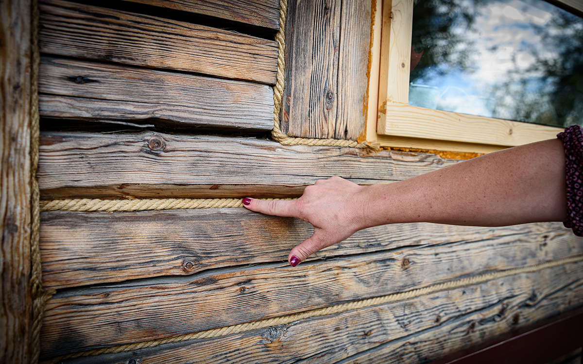 – A boronagerendák közé kőzetgyapot került, ezt pedig jutazsinórral zártuk le, mert kenderzsinórt nem találtunk. Esztétikailag is jó megoldás, kimondottan jól mutat a homlokzaton is – mutatja Réka.