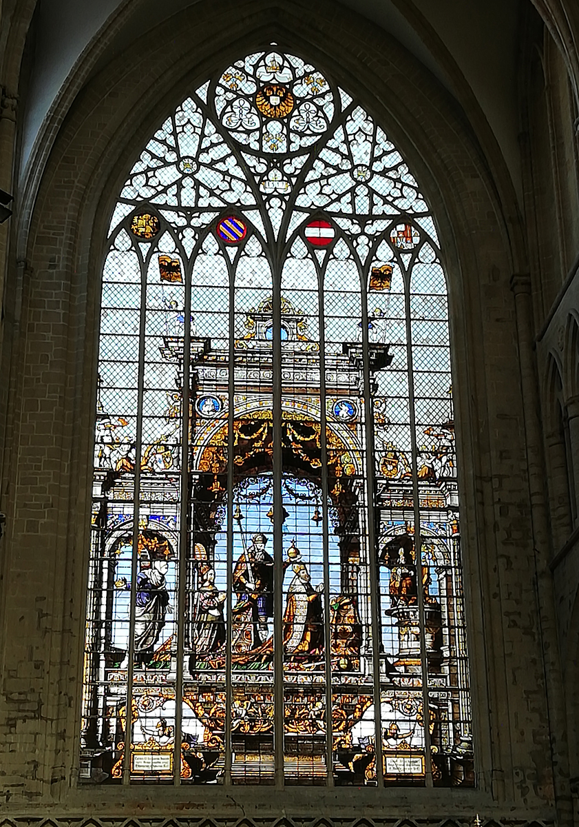 Vele szemben áll az V. Károly királyt ábrázoló ablak, a mögötte álló nőalak a feltételezések szerint Árpád-házi Szent Erzsébet. De Erzsébet portréja látható egy másik ablakon is, Lipót és Albert király társaságában. A templomhajó északi oldalán emelt Saint-Sacrament-kápolna méretes ablakai közül az egyik szintén II. Lajost és Mária királynét ábrázolja védőszentjeik társaságában, fölöttük az oltáriszentség elorzása történetének egyik jelenetét örökítette meg Bernaert mester tanítványa, Michael de Coxcie 1547-ben. Ugyancsak magyar vonatkozású az ismeretlen mester által készített, I. Ferdinánd magyar királyt és Anna királynét ábrázoló üvegablak 1546-ból. A festők munkáját Jean Haeck vitte üvegre. Ugyancsak a Szent Mihály és Szent Gudula-székesegyházban őrzik Szent Erzsébet koponyáját. A fehér falú templomot látogatva kiszínezhetjük magyar történelmi ismereteink fehér foltjait, többet tudhatunk meg az alig húszévesen elhunyt II. Lajosról és a hozzá sírig hű Magyarországi Máriáról.