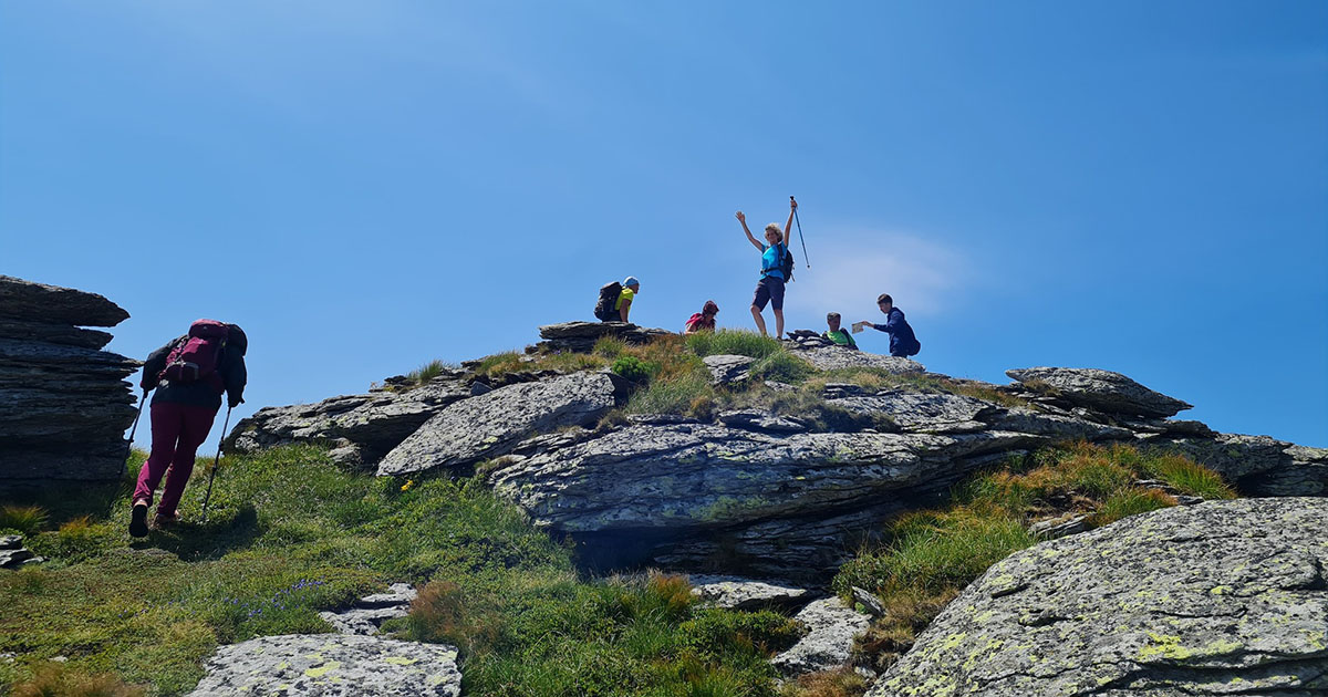 Túravezetőnk, Dobner Imre ismertette a minket körülvevő hegyeket, csúcsokat. Keletről a Kis-Retyezát és a Páring integetett, északkeleti irányból a Retyezát látszott. Ha déli irányba tekintettünk, a Vulkán-hegység jellegzetes Oszlea gerincét láthattuk, nyugatra a Mehádiai-hegység, a Cserna völgye tárult elénk csalogatóan. Miután magunkba szívtuk a táj szépségét, elindultunk visszafelé egy másik, kissé meredekebb útvonalon.