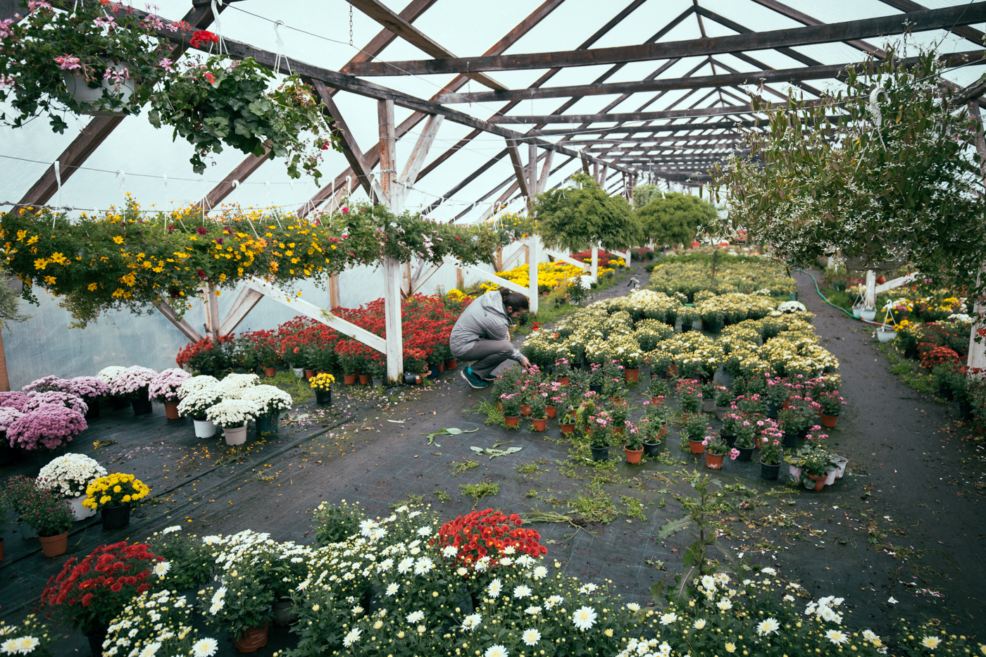 Munkánkat a kadicsfalvi telepen kezdtük el, ahol a fóliaházak és a kert – tekintettel arra, hogy keresett szezonális virág, – tele volt krizantémokkal, de a bimbózó árvácskák is szép számban készülődtek az eladásra. Vajna András, az Édenkert Kertészet tulajdonosa elmondta, hogy a krizantémokat több helyen, köztük a piacon is értékesítik, ezért a kadicsfalvi pontról mindennap fel kell tölteni, frissíteni kell a kínálatot. Mint megtudtuk, a krizantémok hosszú előkészítés és előnevelés után kerülnek csak a vásárlók kezébe, többször átültetik azokat nagyobb cserepekbe, akár kombinálva azokat színüktől függetlenül.
