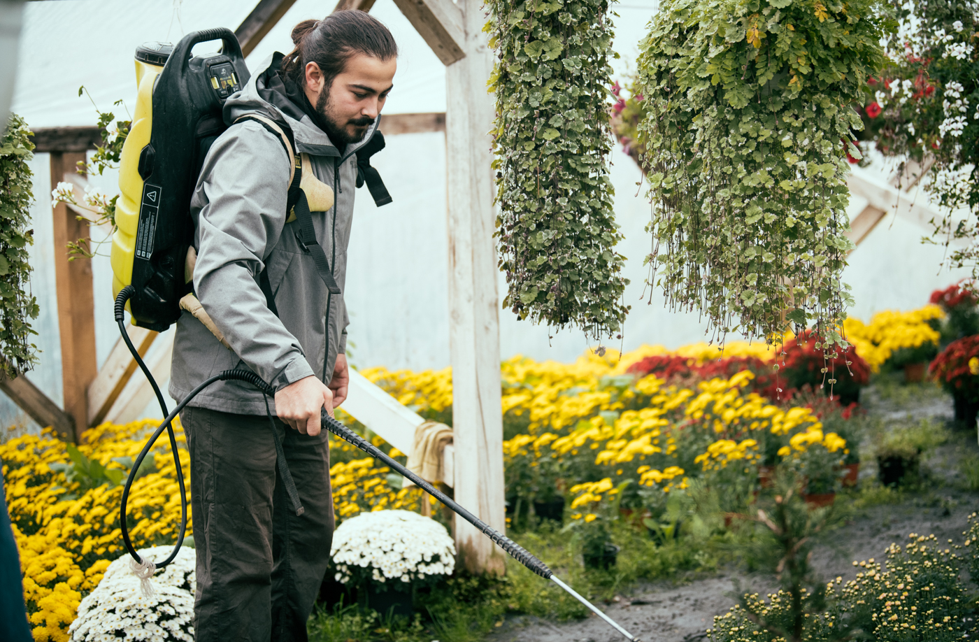 – mutatott rá Vajna, aki szerint a megnövekedett igények és a piaci helyzet miatt a kertészetek nem tudják mellőzni egyes biológiai permetszerek és virágzást elősegítő biológiai anyagok használatát. – Van egy virágzást elősegítő permetszer, amit egy rögzítőanyaggal együtt vízzel elegyítve szórunk szét a bimbózó növényeken. Ez nem jelent nehézséget a növénynek, nem is sokkolja az életvitelét – ismertette, miközben bevegyítette mellettünk a permetszert. – Ebből a szerből nagyjából harminc milliliter kell százötven négyzetméterre. Permetezés közben mindig fontos figyelni arra, hogy csak a bimbós virágokra kerüljön a szerből és ne folyjon le az anyag a bimbón vagy a leveleken – hívta fel figyelmünk. Feladatunk főként az árvácskákra és a krizantémokra terjedt ki, hiszen azokat kell virágba segíteni még a tél beállta előtt.