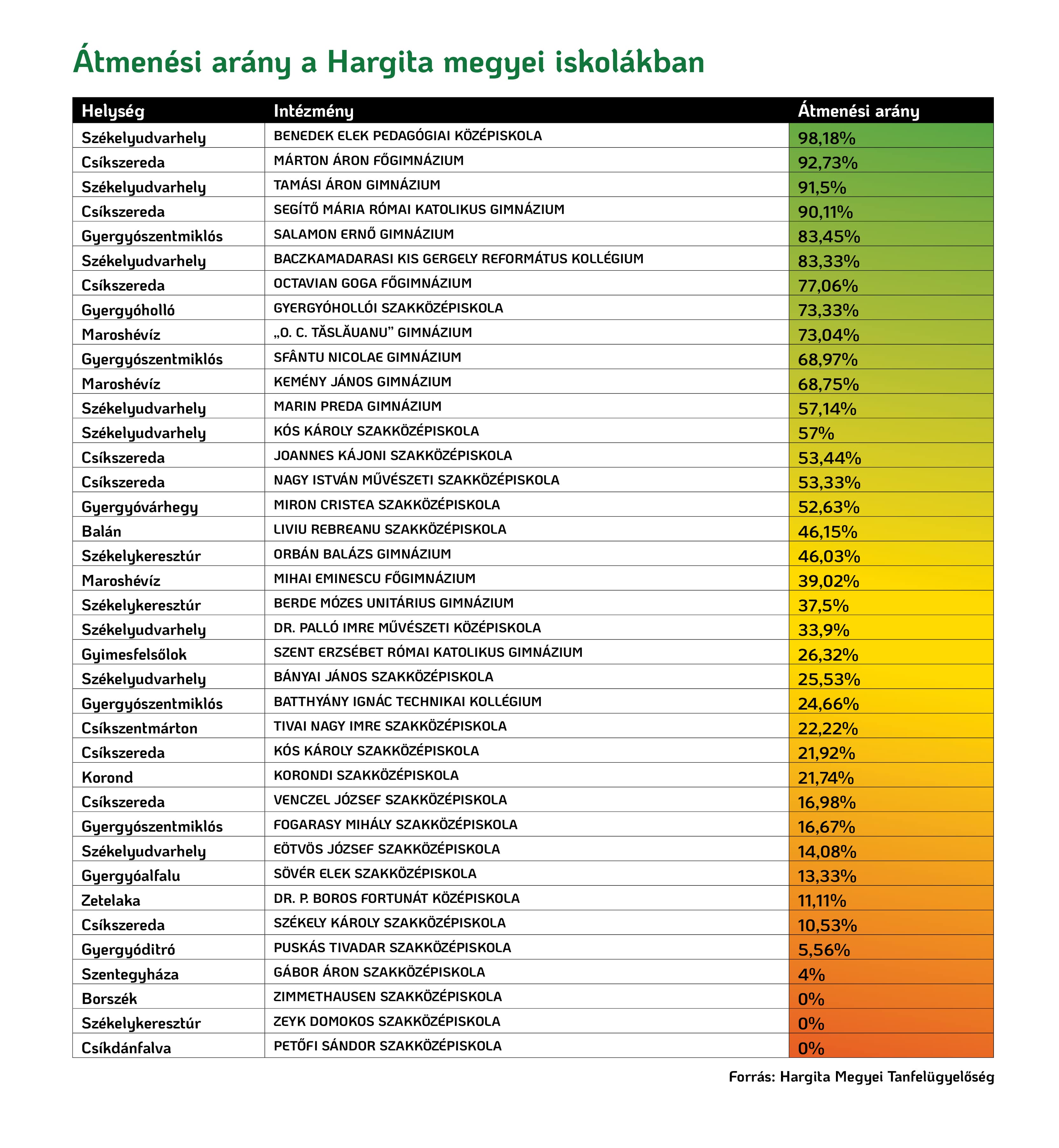 A legjobban a székelyudvarhelyi Benedek Elek Pedagógia Líceum végzősei szerepeltek a megyéből, ott az átmenési arány 98,18 százalék.
