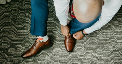 Öltönyhöz fekete vagy barna bőrcipő illik. Feketét a sötét-, középszürke és fekete öltönyökhöz, barnát a bézs és barna árnyalatokhoz kell viselni, világosszürke és sötétkék öltönyhöz pedig mindkettő talál. Ugyanez vonatkozik az övekre is: bőrből készüljön, ugyanakkor harmonizáljon a cipőnk és más bőr kiegészítőnk, például az óra szíjának színével. Nem gond, ha nem egyezik meg pontosan a kiegészítők árnyalata, de fekete cipőhöz ne viseljünk barna övet és fordítva.