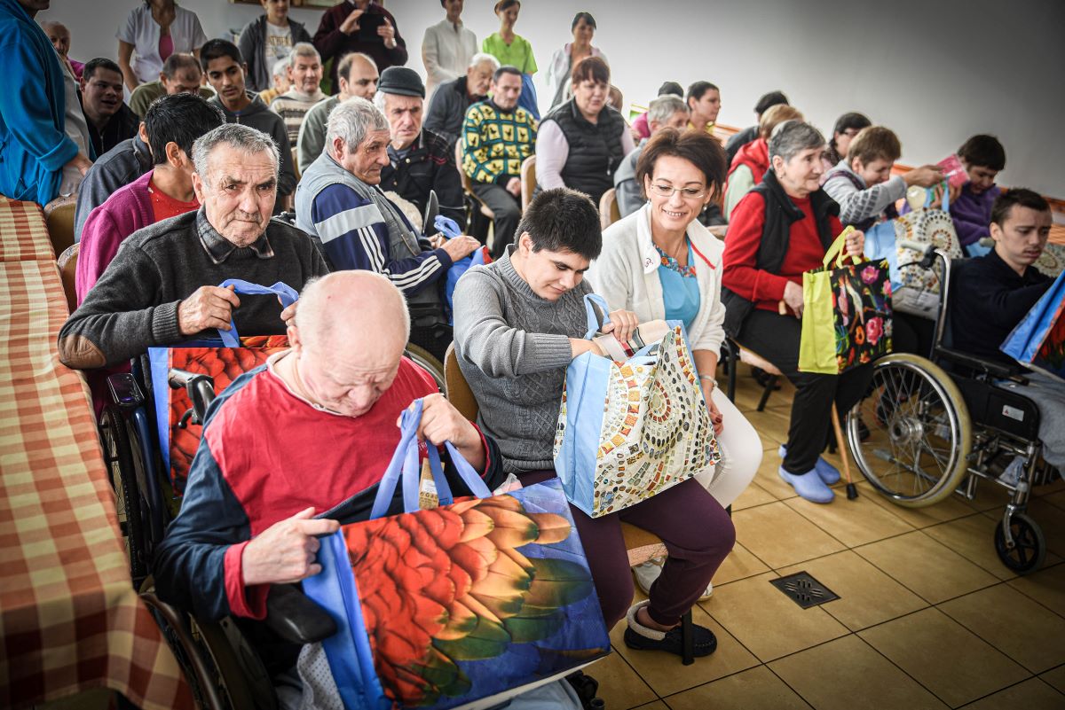 Látogatásunkkor épp a kománfalvi Dă-mi mâna prietene! (Add a kezed, barátom!) alapítvány két munkatársa hozott ajándékokat a bentlakóknak, akik közül néhányan énekkel, saját készítésű csipkékkel, horgolt karácsonyfadíszekkel viszonozták a figyelmességet. Az intézmény vezetője örömét fejezte ki, hogy az alapítvány segít számukra emberhez méltó ünnepet biztosítani az ellátottaknak.