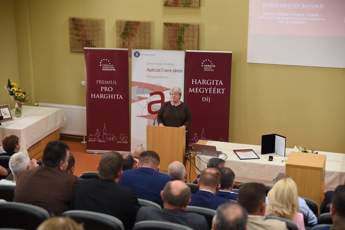 A Hargita megyéért díjat 2001-ben alapította a megyei önkormányzat, és évről évre olyan személynek adományozzák, aki kiemelkedő tevékenysége által hozzájárult a megye jó hírének öregbítéséhez. Az elismerést idén Burus-Siklódi Botond, a Romániai Magyar Pedagógusok Szövetségének (RMPSZ) elnöke kapta. Korodi Attila, Csíkszereda polgármestere köszöntötte a jelenlévőket, majd a díjazott kilétét Borboly Csaba, Hargita Megye Tanácsának elnöke fedte fel