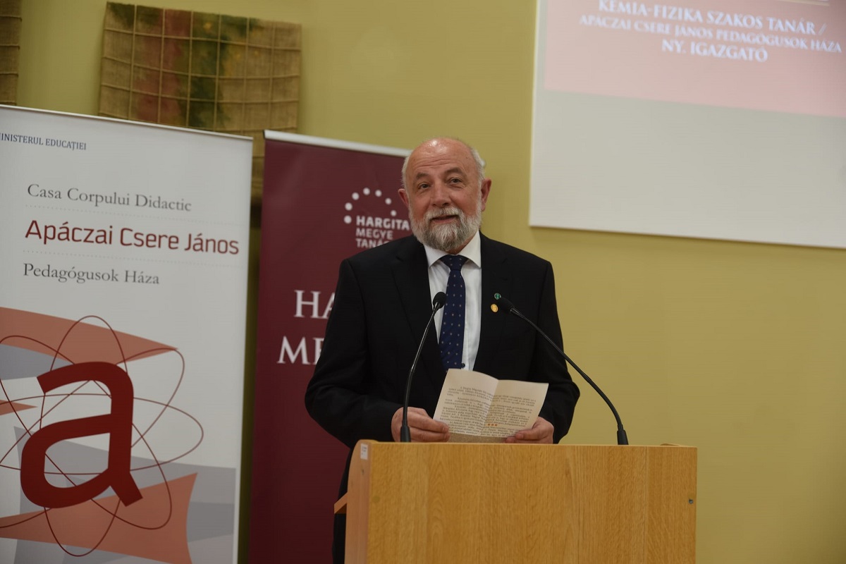 – Hosszú éveken át volt a Hargita Megyei Pedagógusok Házának igazgatója, melynek elsődleges célja a megye pedagógusainak, tanintézetvezetőinek, valamint a közoktatásban dolgozó kisegítő személyzet szakmai továbbképzése. Az intézmény az ő javaslatára vette fel 1997-ben Apáczai Csere János nevét és a díjazott az egykor omladozó bentlakásépületből több mint két évtizednyi kitartó munkával olyan infrastrukúrát alakított ki, ahol ízléses környezetben és 21. századi technológiával felszerelt, modern intézmény várja a pedagógusokat – fogalmazott Erősdi.