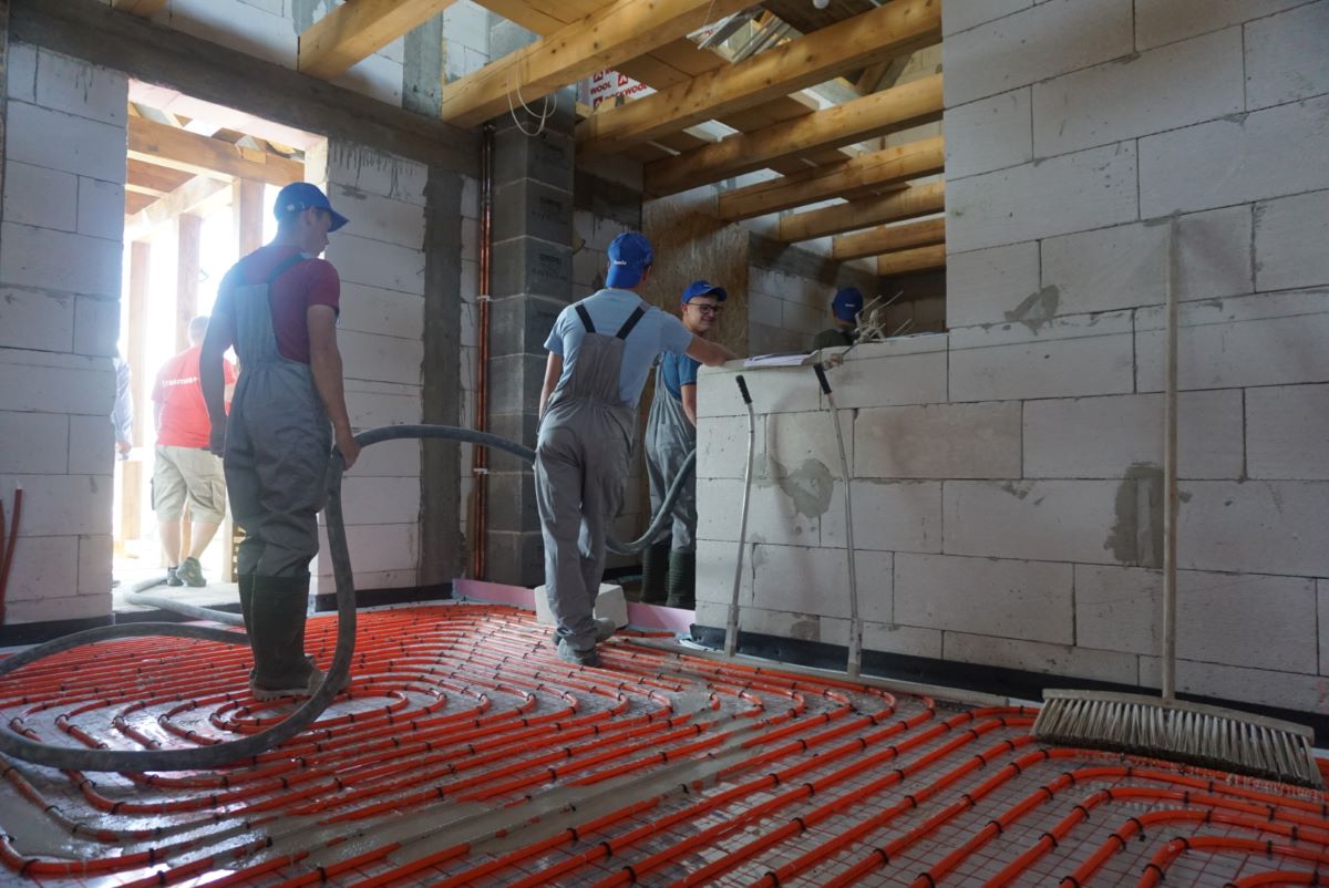 Koszta Rab Zoltán, a Cemix építőanyag területi képviselője megjegyezte: a pálfalvi munkaponton használt estrich-beton előnye, hogy jó hőleadó tulajdonsággal rendelkezik, így a padlófűtéssel fűtött házakhoz ideális. Emellett gyorsabban lehet vele dolgozni, homogénebb anyagot készíthetnek és kevesebb munkaerőt igényel.