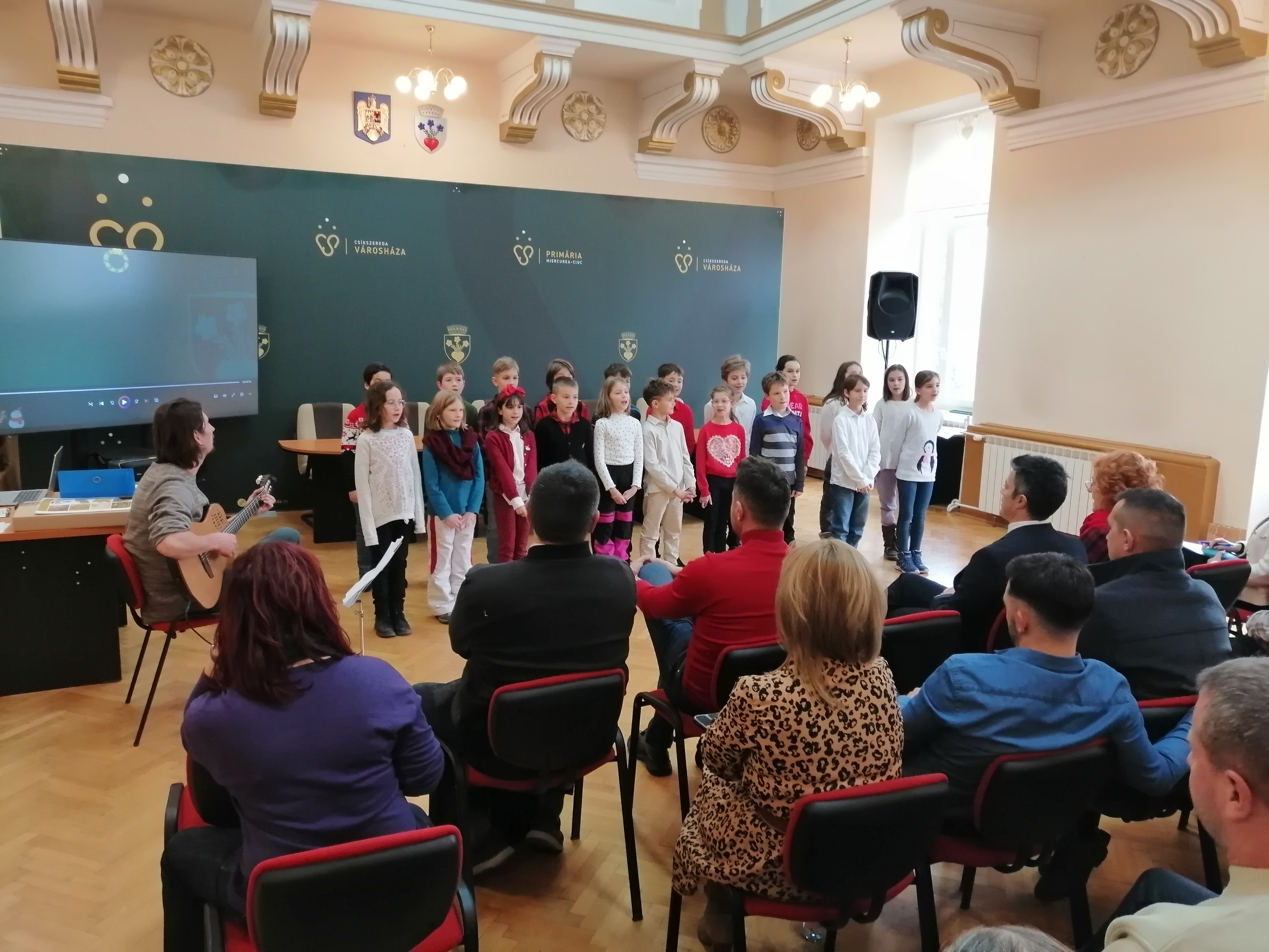 Igazi karácsonyváró hangulattal örvendeztették meg a csíkszeredai Nagy István Művészeti Középiskola 3. B osztályos tanulói a városháza alkalmazottait, önkormányzati képviselőit, elöljáróit pénteken, az év utolsó soros havi ülését megelőzően. A diákok hangulatos előadását – amelyet vastapssal jutalmaztak a jelenlévők – Krizbai Imre zenetanár kísérte gitáron. A fellépést követően napirend előtti felszólalásában Korodi Attila polgármester értékelte a mögöttünk hagyott esztendőt.