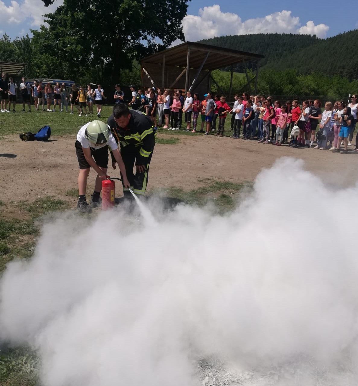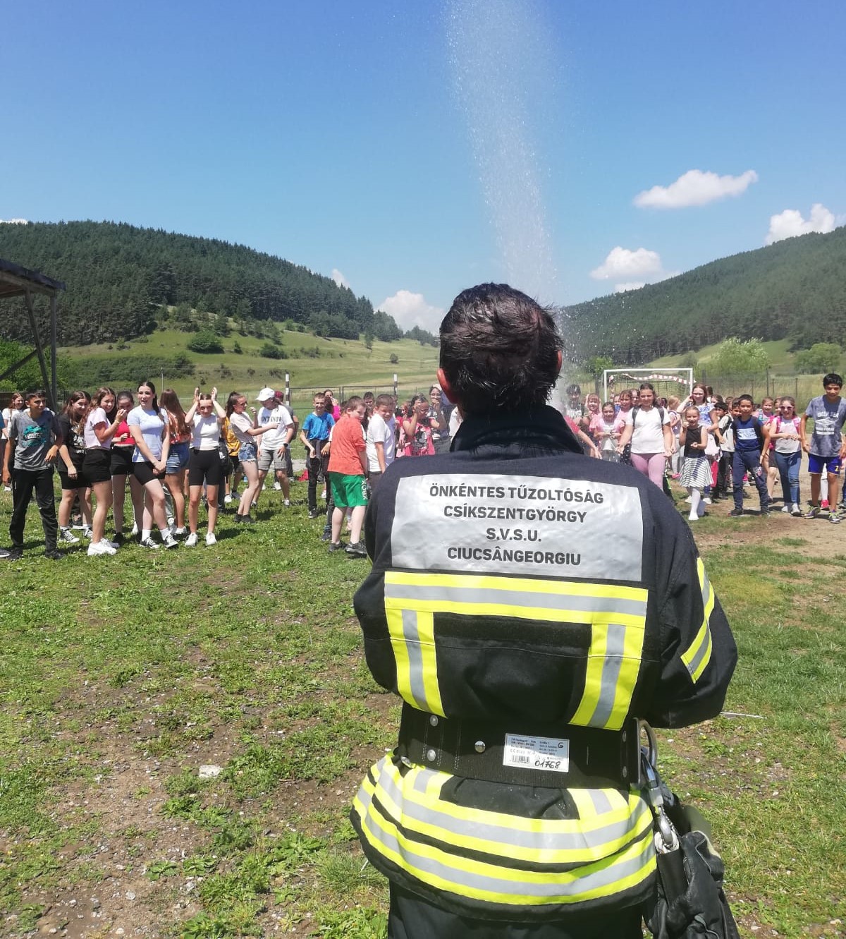 A tűzoltósági gyakorlat végén a tűzoltópalack használatát is bemutatták a diákoknak, akik kipróbálhatták az eszköz működését. A bemutató frissítő vízlocsolással zárult.