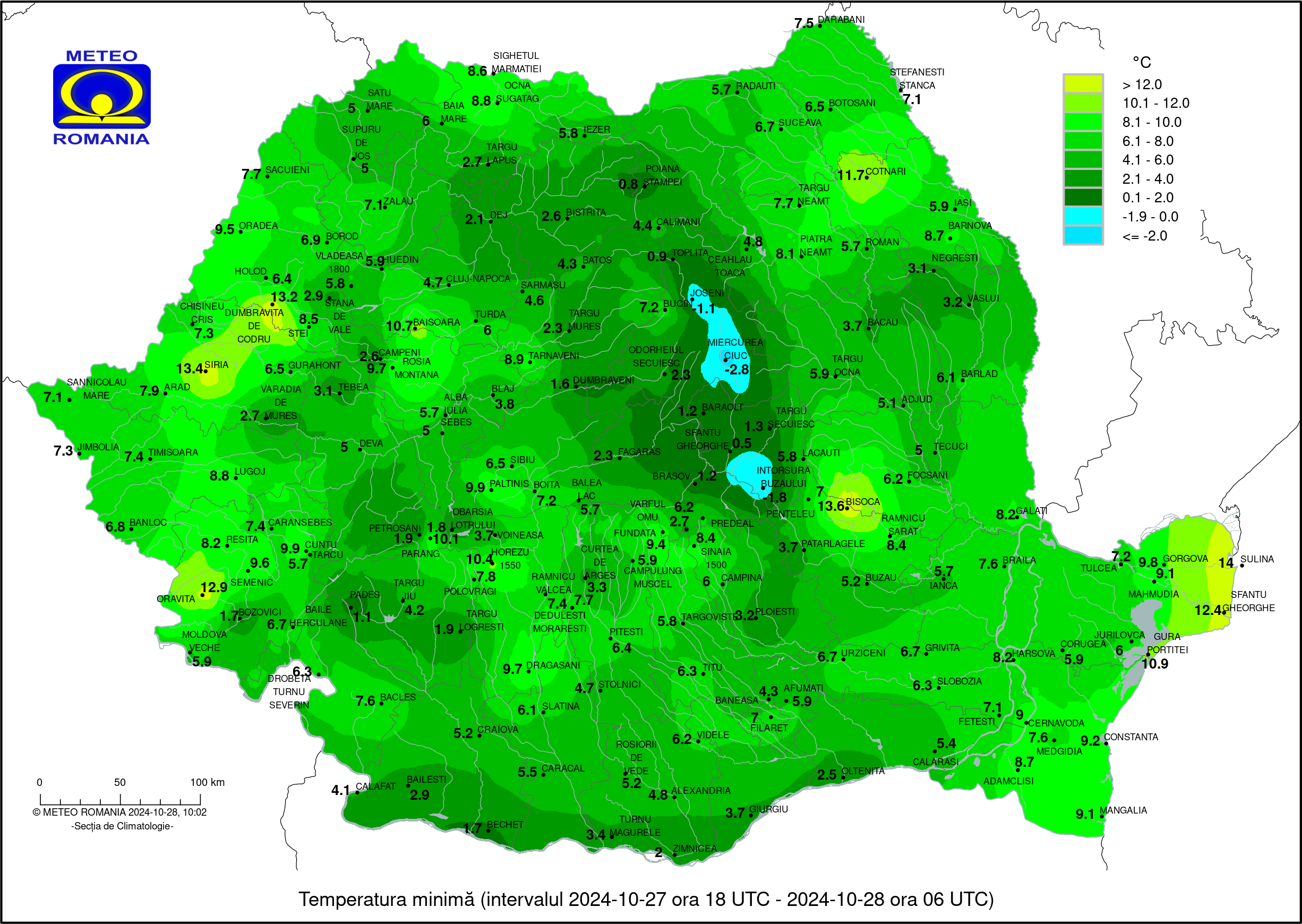 Október 28-án hajnalban ismét Hargita megye bizonyult az ország leghidegebb térségének: Csíkszeredában -2,8 Celsius-fokot mértek, ami a legalacsonyabb hőmérséklet volt Romániában az éjszaka folyamán. Gyergyóalfaluban -1,1 Celsius-fokot mértek.