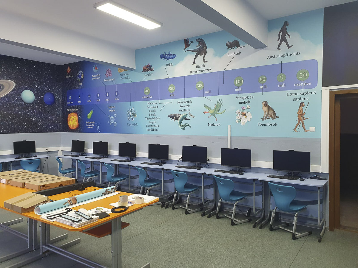 – Miután berendeztük a termet, volt egy pici hiányérzetem, hogy szép, modern, de nem biztos, hogy annyira vonzó. Azért, hogy legyen még kellemesebb a hangulata, terveztem egy tematikus tapétát, ami átfogóan ábrázolja, hogy honnan indult az ember és a létezés, hová jutott el és mi lehet a jövő