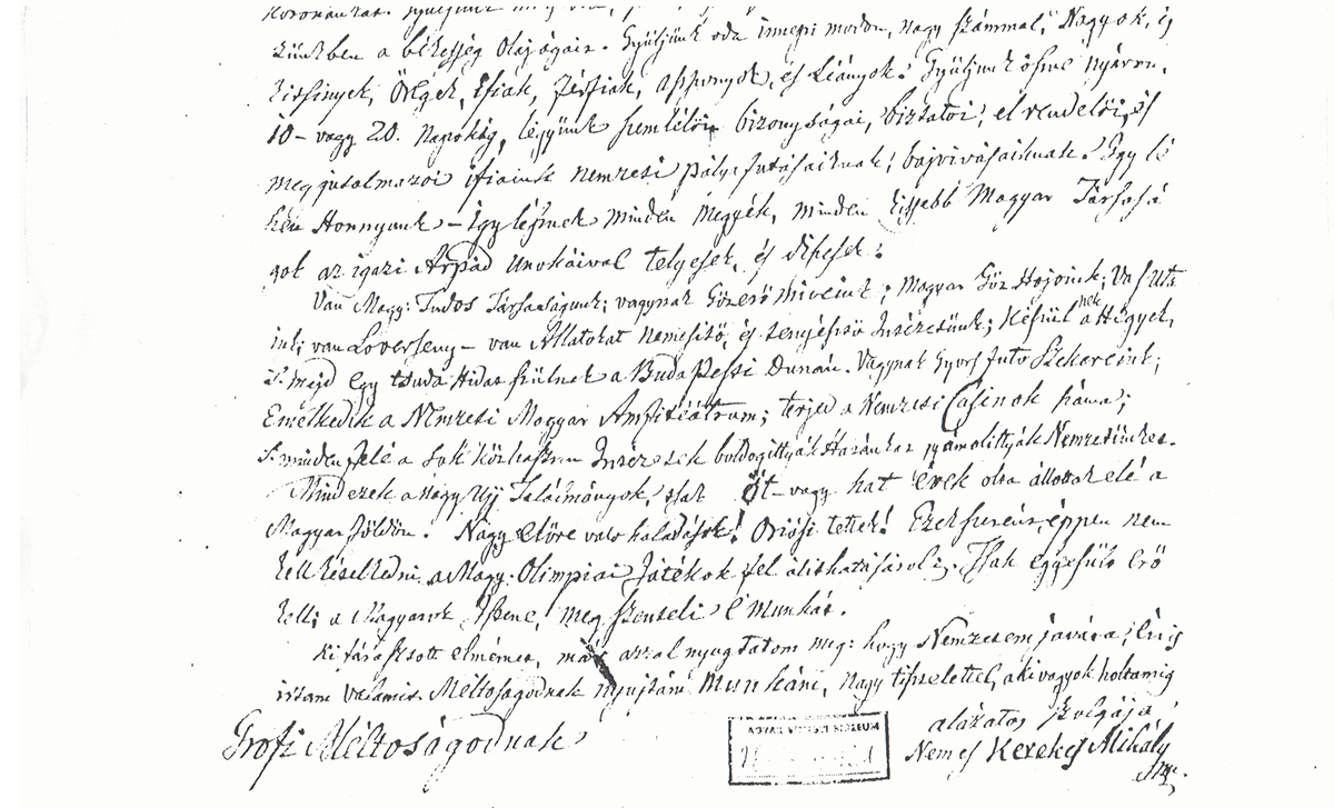 „Vezessük hát ifiainkat az oly hasznos, de szükséges mulatságokra, melyek által a testi erő tehetség neveltetik: a serénység bátorság, vitézi tettekre éledezik. Keltsük fel őket, ragadjuk ki felidézett Mulattságokból. Küldjük, hívjuk, vigyük őket, férfiakat éledező vitézeket formáló Ősi Magyar nemesi létre testének gyakorlására. Készítsük jól megalapítva, minden 4. vagy szökőévben a Nemzeti Magyar Olimpiai Játékokat mint valaha a régi görögöknél. Virágzó Magyar Hazánk közepében áll a Magyar Athenas, azaz Buda Pest Városa. Ennek végén van a Campus Martius, azaz a dicsőséges Rákos mezeje, ahol oly sok nevezetes Országos gyűléseket tartottak, olyan sok vért folytattak, hogy vérpatakok között megtartották Hazánkat, Koronánkat. Gyüljünk mi is oda ünnepi módon, ismét üssük fel Nemzeti Sátorunkat, kezünkbe a békesség olajágát. Gyüljünk oda ünnepi módon nagy számmal. Kicsinyek, öregek, ifiak, férfiak, asszonyok és leányok. Gyüljünk nyáron 10 vagy 20 napig, legyünk szemlélői, bizonyságai, biztatói, elrendelői és megjutalmazói ifjaink nemzeti pályafutásának, bajvívásainak. Ezek képpen nem kell késlekedni az Olimpiai játékok felállításával, tsak egésség, erő kell, a Magyarok Istene megszenteli e munkát.” Nemes Kerekes Mihály - Brad, 1836