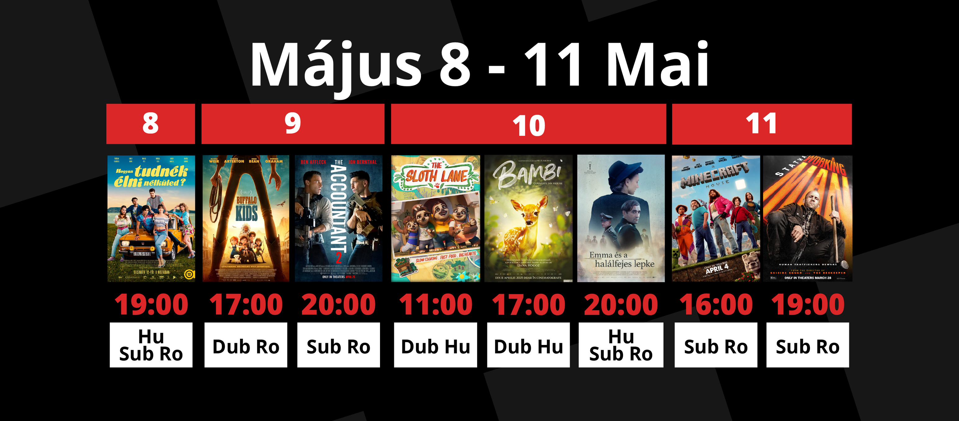 Csütörtökön 19 órától vetítik a Hogyan tudnék élni nélküled? című magyar zenés vígjátékot román felirattal. Pénteken 17 órától a Buffalo Kids című animációs kalandfilm lesz látható román nyelven, majd 19 órától A könyvelő 2 (The accountant 2.) akcióthriller eredeti (angol) nyelven, román felirattal. Szombaton 11-től a The Sloth Lane című animációs kalandfilmet mutatják be magyar nyelven, 17 órától a Bambi című animációs dokumentumfilmet magyarul, 20 órától pedig az Emma és a halálfejes lepke című történelmi drámát nézhetik meg az érdeklődők eredeti (magyar) nyelven, román felirattal. Vasárnap az élőszereplős svéd–amerikai családi kalandfilmet, az A Minecraft Movie-t (Egy Minecraft-film) tűzik műsorra angol (eredeti) nyelven, román felirattal, a vasárnapi vetítések sorát A melós (A Working Man) című akcióthriller zárja angol (eredeti) nyelven, román felirattal. A vetítésekre jegyek válthatók a bilete.ro honlapon.