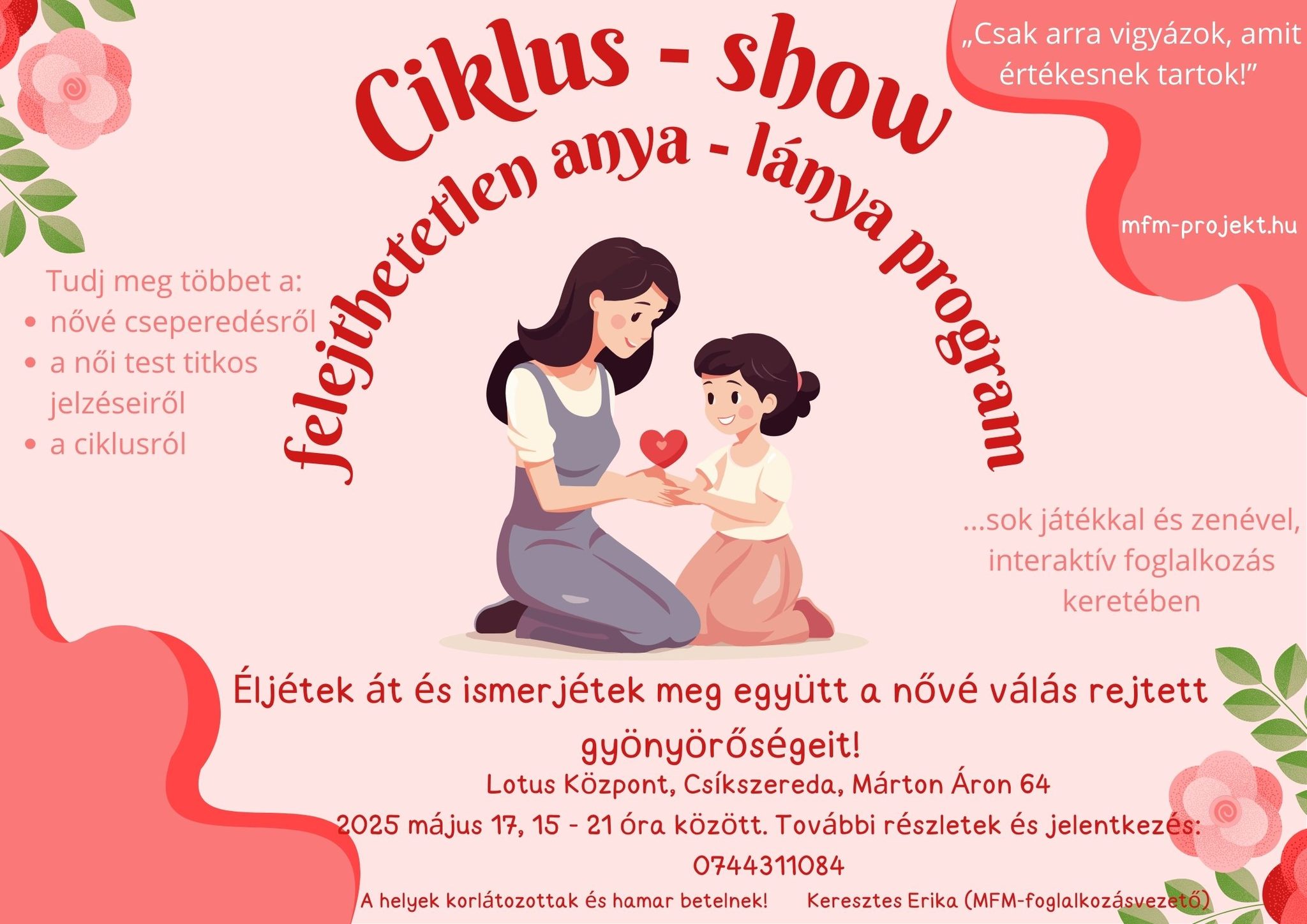 Közös tanulási napot szervez anyáknak és lányaiknak Keresztes Erika MFM-Ciklusshow foglalkozásvezető, Aviva-módszer-oktató és lelkigondozó szombaton 15 órától, a csíkszeredai Lotus központban (Márton Áron utca 64. szám). A foglalkozás témája a női test titkos jelzései és a női ciklus eseményeinek története. Érdeklődni és jelentkezni a 0744–311084-es telefonszámon lehet, a helyek száma korlátozott.