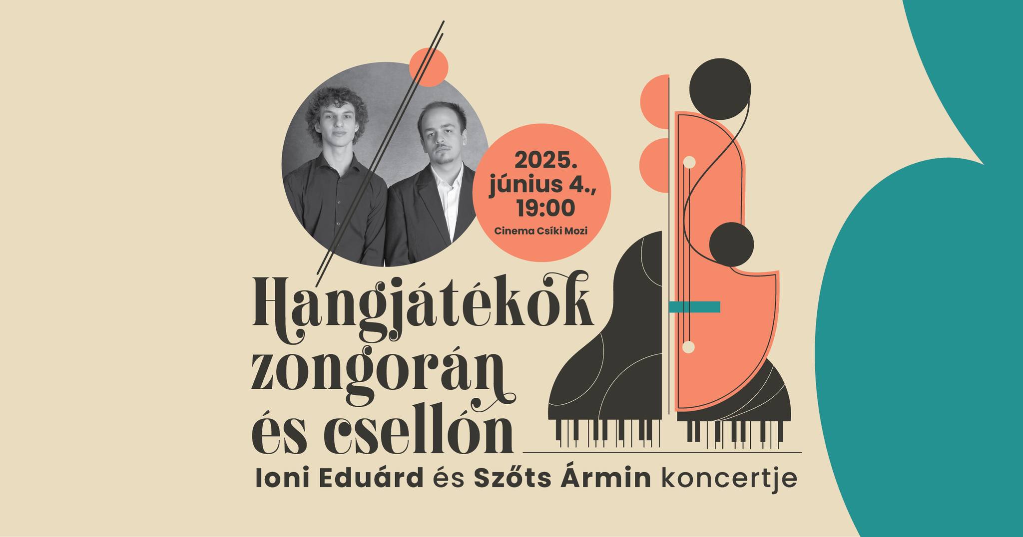 Ioni Eduárd és Szőts Ármin cselló-zongora duóként koncertezik szerdán 19 órától a Csíki Moziban. Fiatal koruk ellenére előadásukat kifinomult zenei kifejezésmód és technikai felkészültség jellemzi, játékukat áthatja a zene iránti mély elköteleződés és szenvedély, amely minden megszólaltatott hangban érzékelhető. A koncertre a belépő ára 30 lej, a kedvezményes jegy 15 lej. A teljes árú jegy elővételben megvásárolható a bilete.ro honlapon és a Csíki Mozi jegypénztárában, a kedvezményes belépő pedig kizárólag személyesen vásárolható meg a jegypénztárban.