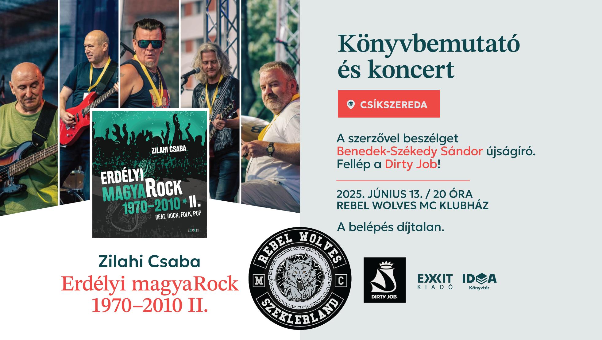 Zilahi Csaba Erdélyi magyaRock 1970–2010 könyvének második kötetét mutatják be pénteken 20 órától Csíkszeredában, a Rebel Wolves MC klubházban. Az eseményen a szerzővel Benedek-Székedy Sándor beszélget, majd fellép a Dirty Job zenekar. A kötet az Exit Kiadó gondozásában jelent meg. Az esemény az IDEA Könyvtér és a Rebel Wolves MC klubház szervezésében valósul meg. A belépés díjtalan.
