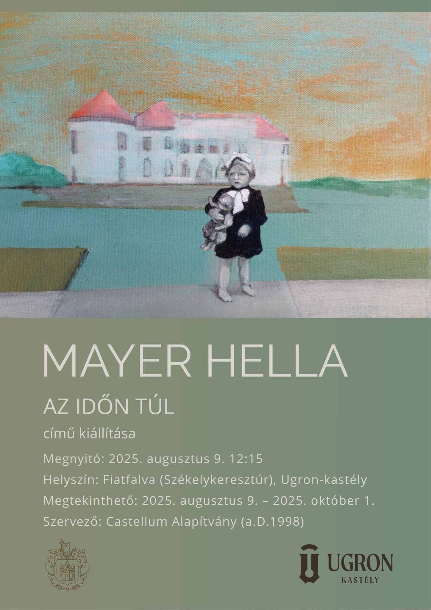Mayer Hella képzőművész Az időn túl című kiállításának megnyitóját tartják szombaton 12.15-kor a fiatfalvi Ugron-kastély Palatium termében. „Az a határ érdekel, ami a tudattalan és a tudatos között húzódik: különösképpen ezen a határmezsgyén való egyensúlyozás, átmenet, átlépés. Álom és valóság, álmodozás és jelenlét, jelen és múlt, élet és halál, magány és szerelem, öröm és búbánat – állapotok, melyekből az átlépés kalandos. A képek nem azt sugallják, ami elillan, hanem azt tárják fel, ami nem múlik el” – írja a művész a Fiatfalván bemutatott festményeiről. A megnyitón beszédet mond Bandi Katalin textilművész. A tárlat október 1-ig látogatható. Szervező: Castellum Alapítvány (a.D. 1998) és az Erdélyi Magyar Történelmi Családok Szervezete.
