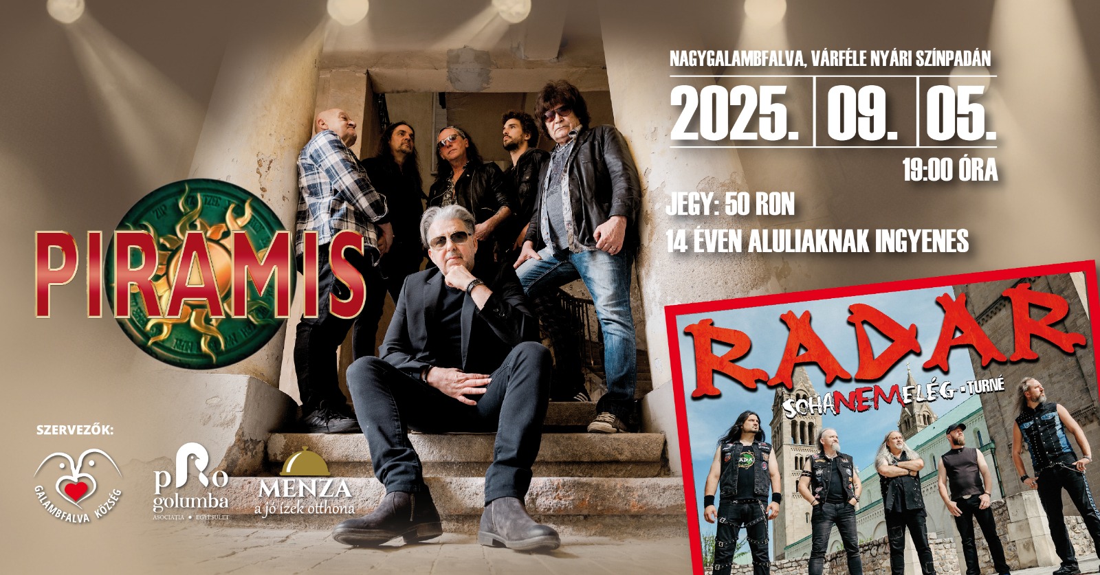 Két legendás magyar zenekar, a Piramis és a Radar lép színpadra pénteken 19 órától Nagygalambfalván, a Várféle Nyári Színpadon, hogy felejthetetlen élményt nyújtson minden korosztály számára. A belépő ára 50 lej, elővételben megvásárolható a jegyek.menza.ro honlapon és a helyi élelmiszerüzletekben, 14 év alatt gyermekeknek a belépés ingyenes.